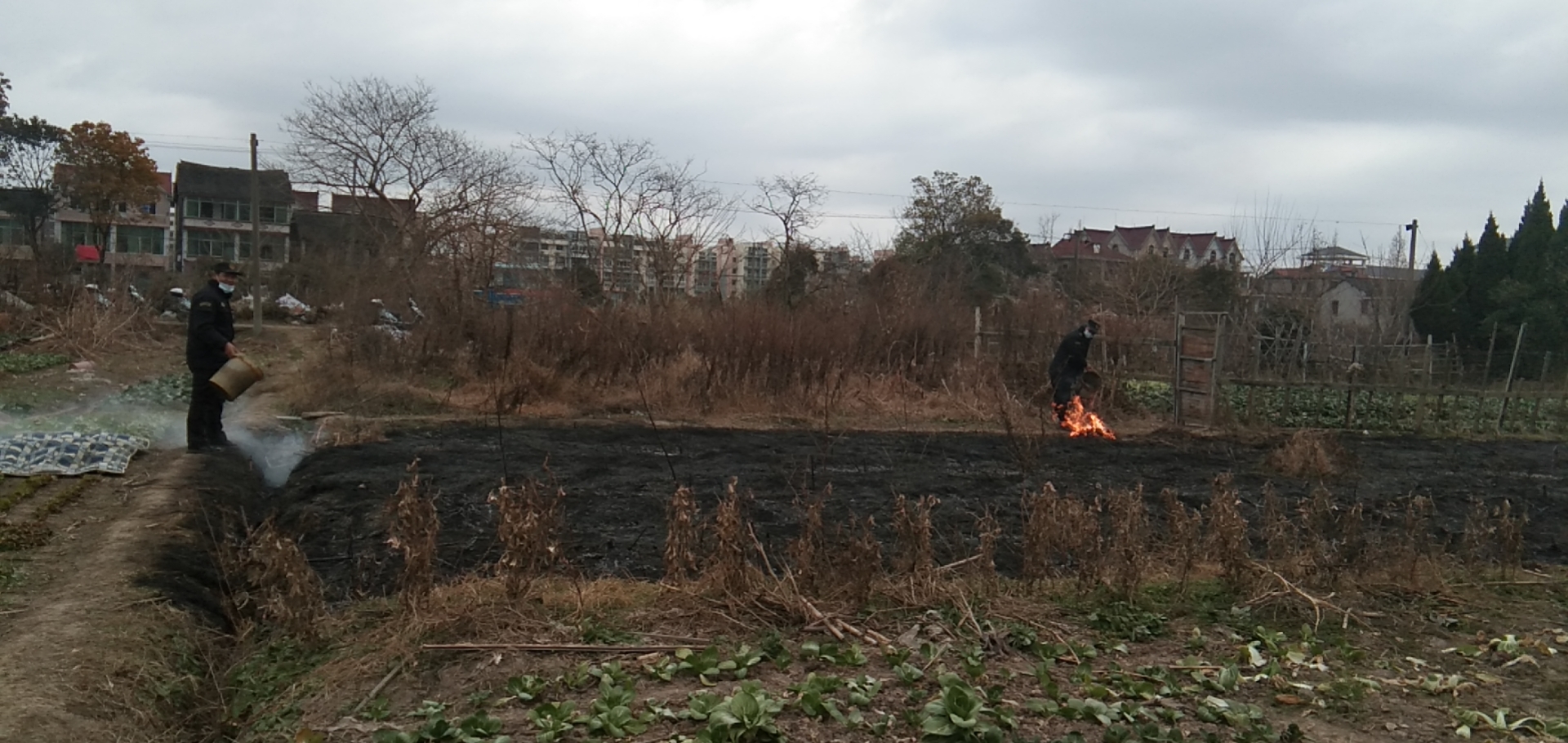 當天12:00左右,孫晉國、陳孟恩、王雙禧巡邏時(shí),發(fā)現紅光地塊附近有濃煙冒起,便立即趕過(guò)去查看。原來(lái)是因村民焚燒垃圾引燃了附近雜草,導致周邊草地大面積起火。情況緊急,三人立刻到附近單位,找來(lái)水桶提水滅火,經(jīng)過(guò)近一個(gè)小時(shí)的撲救,終于將火撲滅。