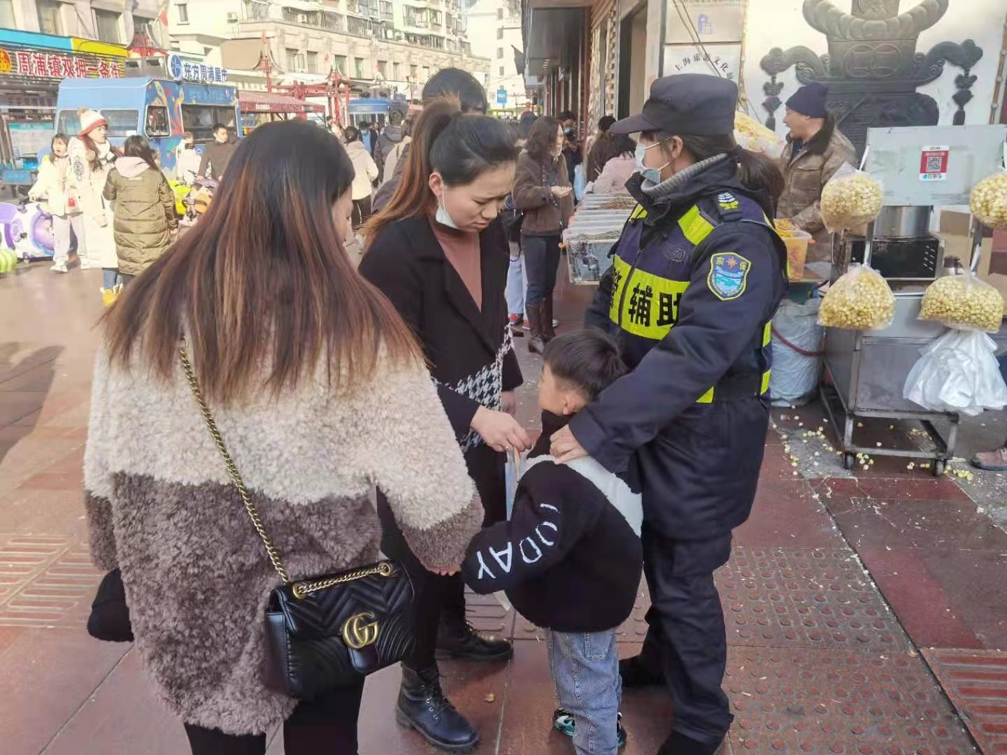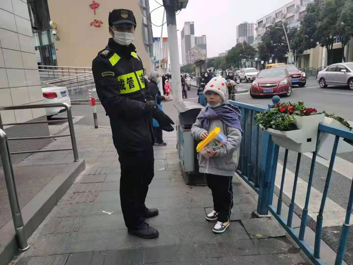 1月5日,宗保公司駐周浦市容機動(dòng)組隊員鄒學(xué)峰幫助走散女童找到家人。