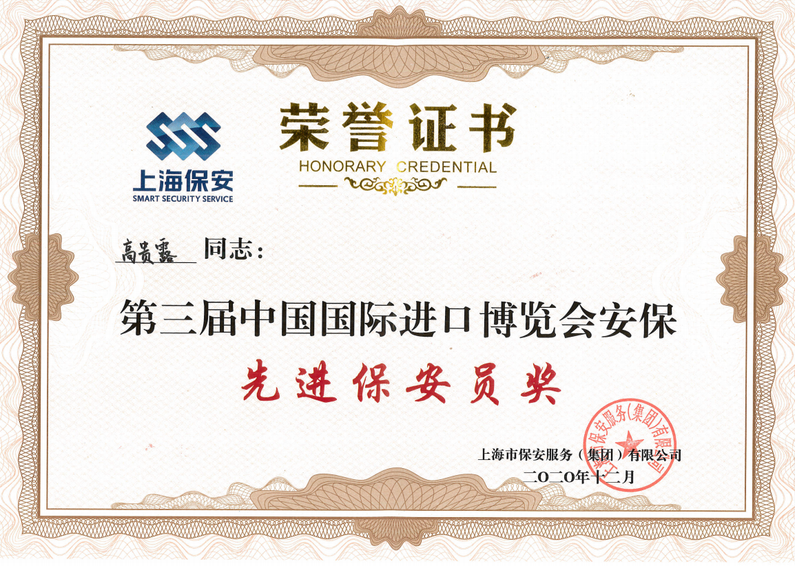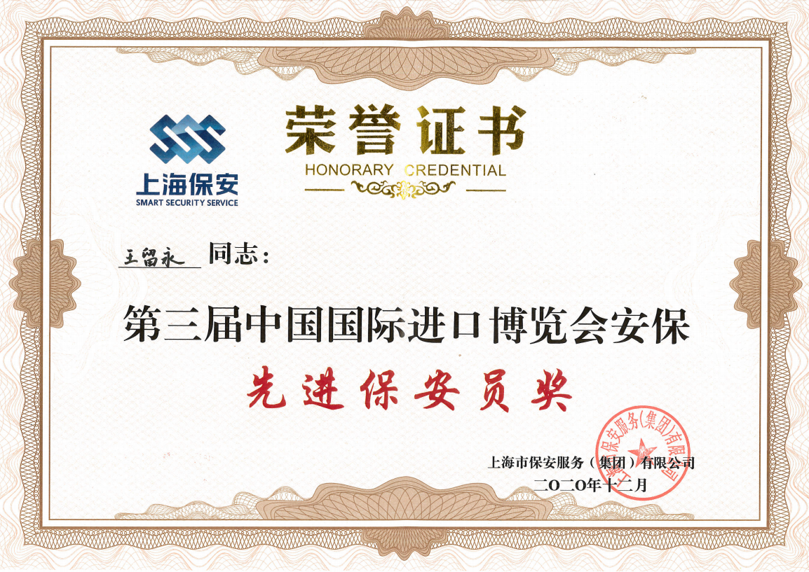 宗保公司以忠誠履職的責任擔當、規范細致的工作標準、飽滿(mǎn)昂揚的精神狀態(tài),圓滿(mǎn)完成了第三屆中國國際進(jìn)口博覽會(huì )安保服務(wù)保障工作任務(wù)。其中,公司王留永、高貴露兩名隊員因工作表現突出,榮獲第三屆中國國際進(jìn)口博覽會(huì )“安保先進(jìn)保安員獎”。同時(shí),王留永還被授予第三屆中國國際進(jìn)口博覽會(huì )安保工作“黨員先鋒”榮譽(yù)稱(chēng)號。