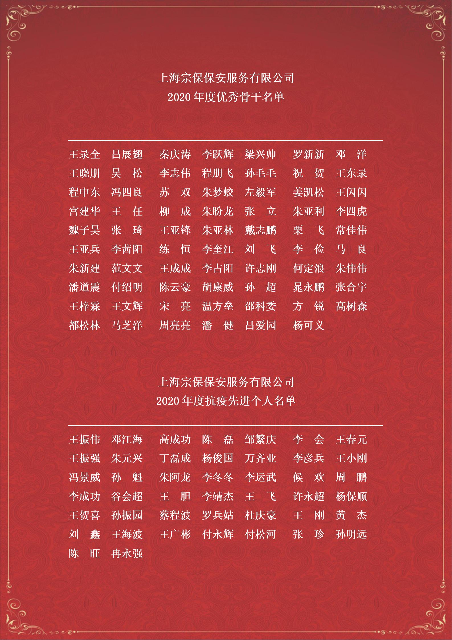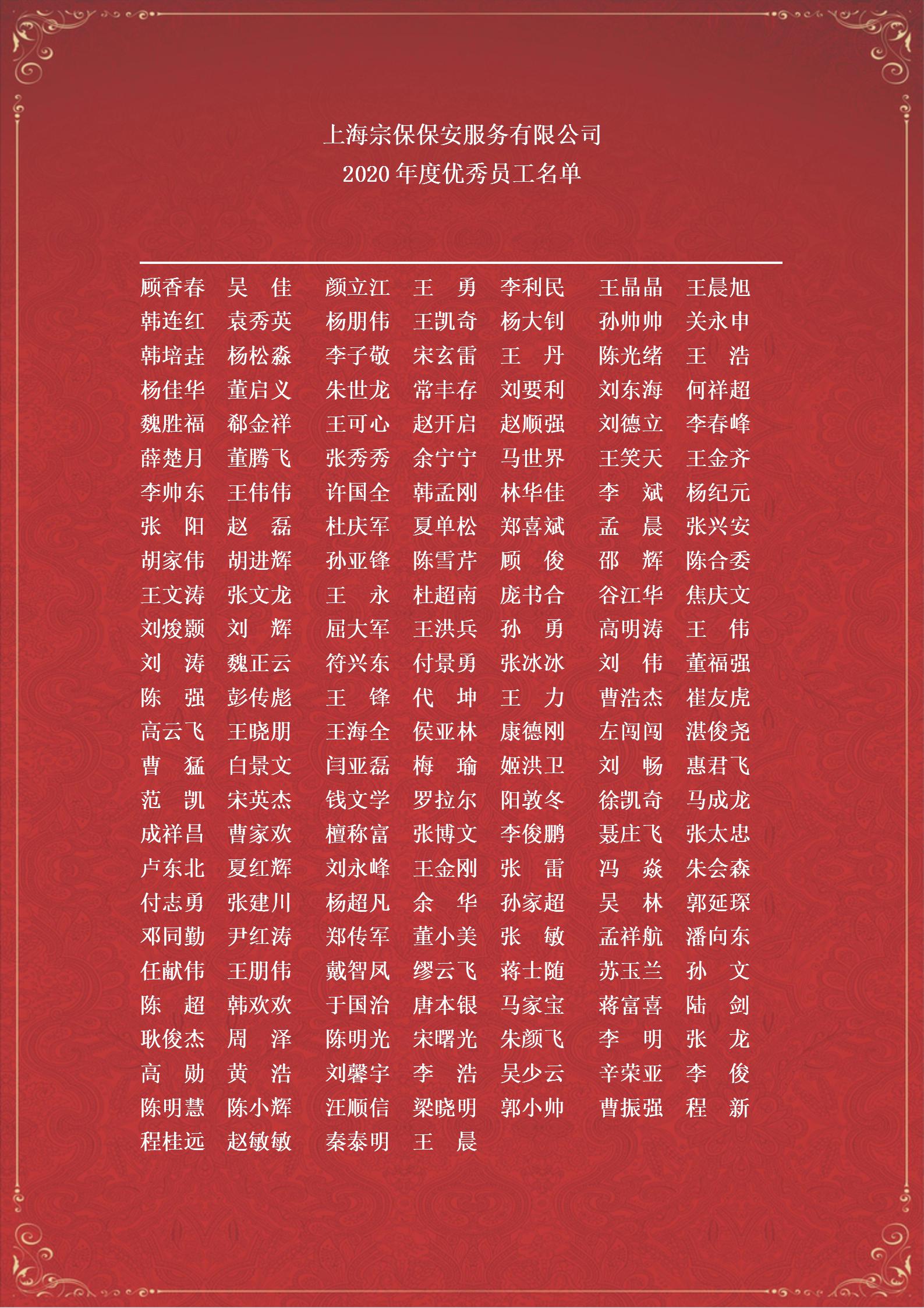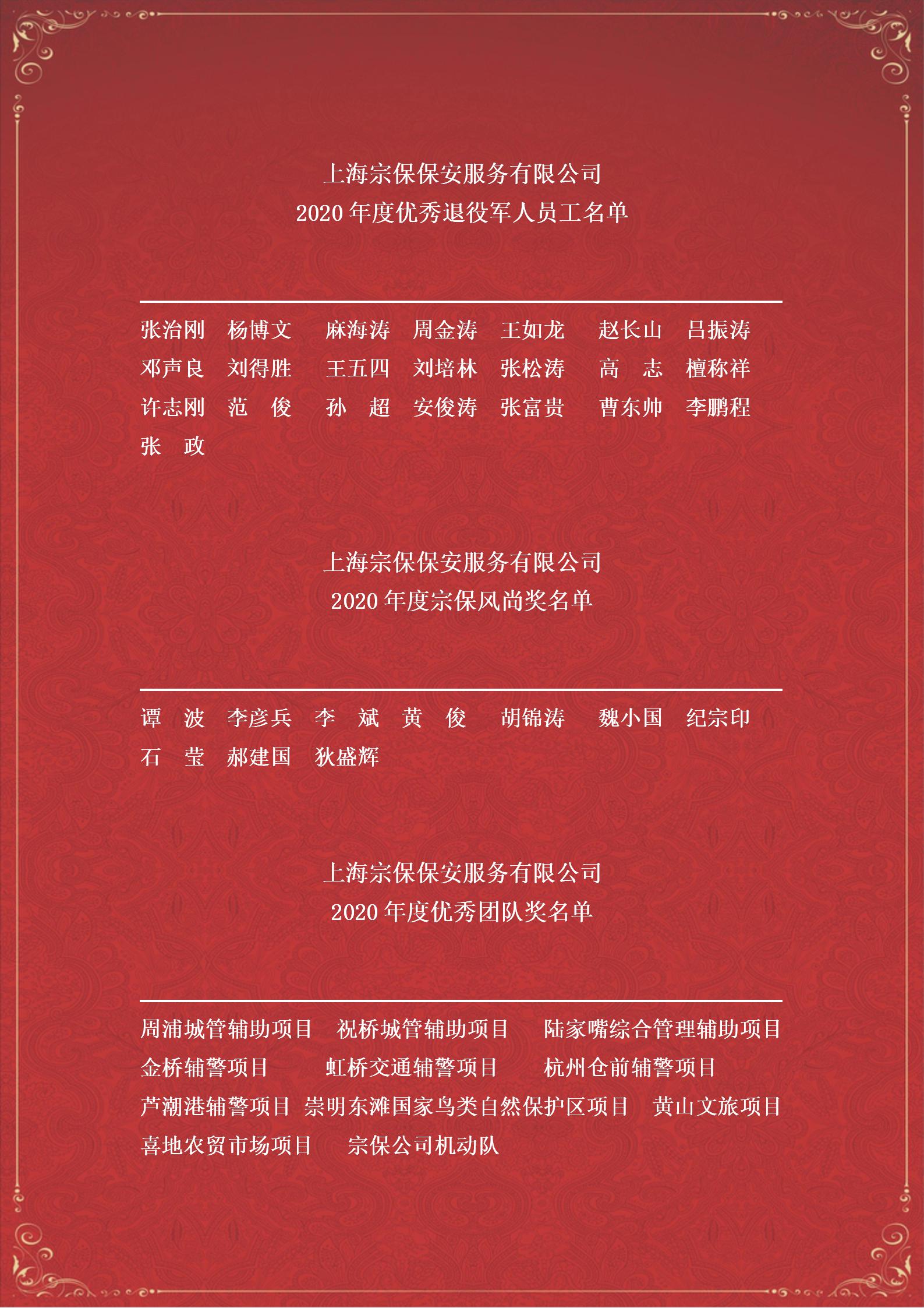 2020年是極不平凡的一年,廣大宗保人勠力同心、共克時(shí)艱、篤定前行,公司建設呈現出健康穩步發(fā)展的良好態(tài)勢。為表彰先進(jìn)、樹(shù)立典型,激勵更多員工,在各項目、各區域逐級推薦、嚴格評審的基礎上,經(jīng)公司董事會(huì )研究,決定對11個(gè)“優(yōu)秀團隊”、22名“優(yōu)秀退役軍人員工”、44名“抗疫先進(jìn)個(gè)人”、10名“宗保風(fēng)尚獎”、69名“優(yōu)秀骨干”和179名“優(yōu)秀員工”進(jìn)行通報表彰獎勵。
