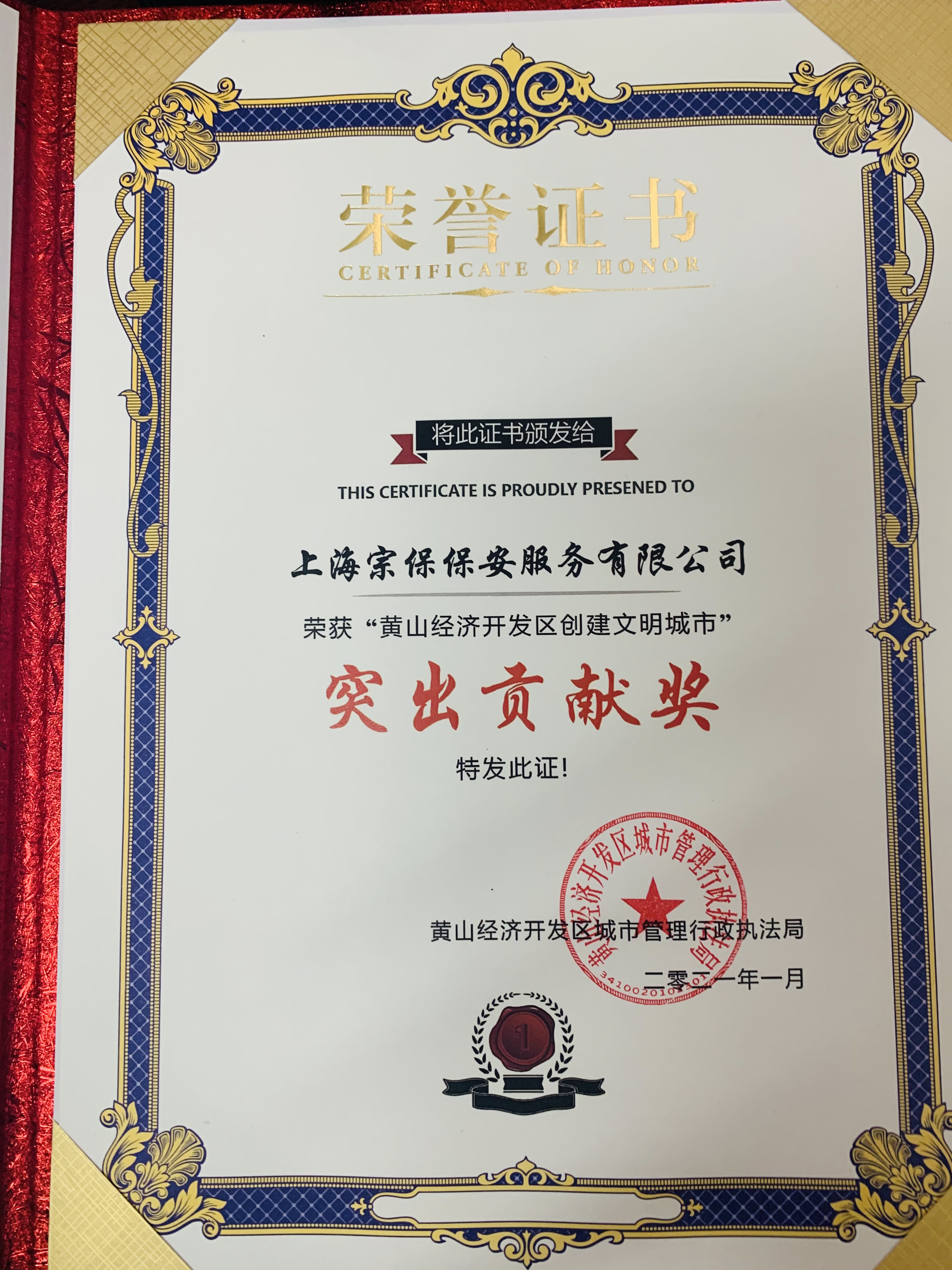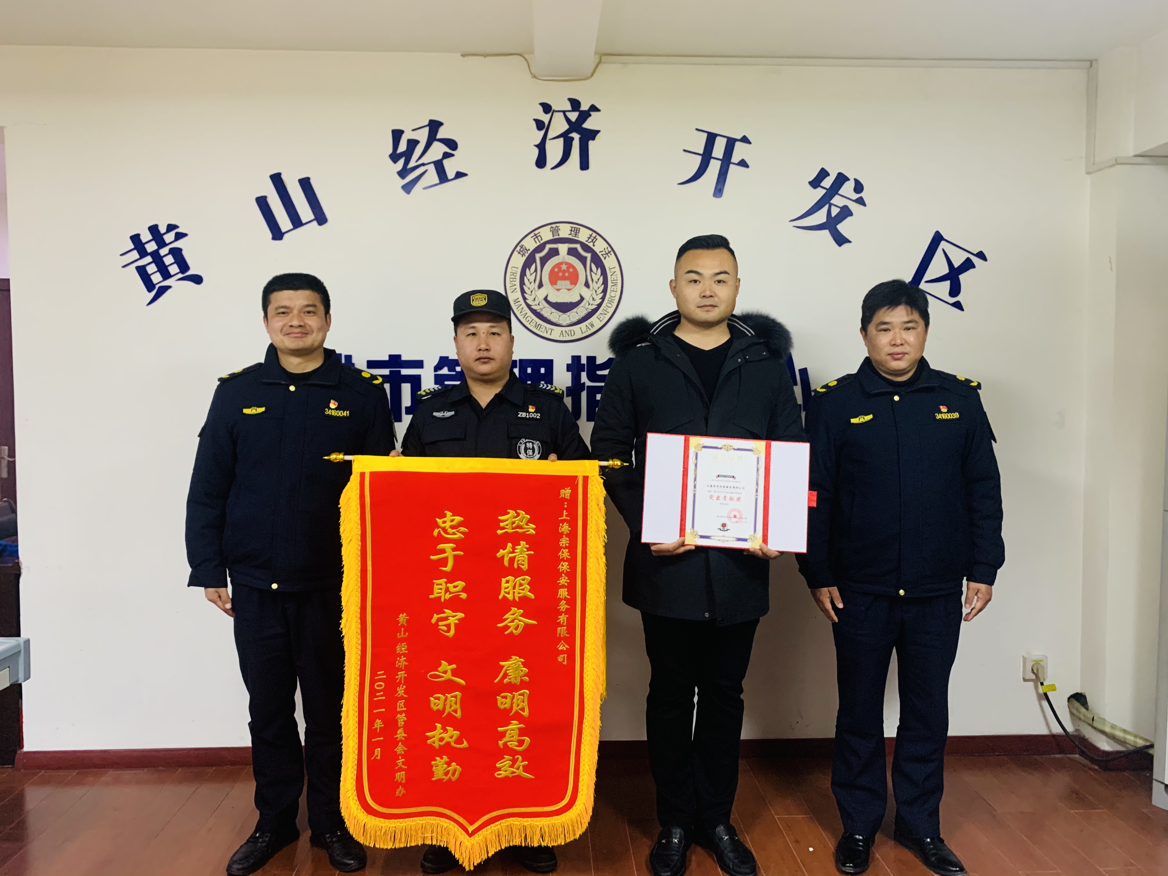 2月2日,黃山高新區城市管理行政執法局局長(cháng)劉崗、執法大隊大隊長(cháng)汪振為獲評黃山高新區“創(chuàng )建文明城市突出貢獻獎”的上海宗保保安服務(wù)有限公司頒發(fā)證書(shū),贈送錦旗。
