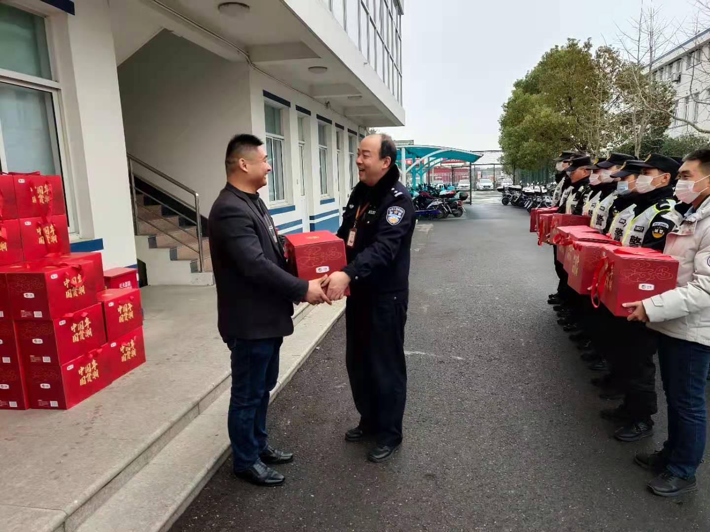 分管民警帶著(zhù)所領(lǐng)導的濃濃關(guān)懷之情,給隊員們送上新春大禮包,感謝隊員為轄區的平安建設作出的貢獻。向春節期間不回家、留守在一線(xiàn)的隊員致以敬意,并祝愿隊員們新春快樂(lè )、身體健康、闔家幸福!