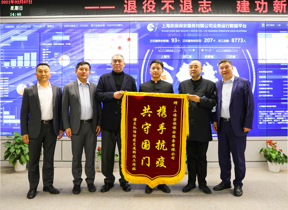 2月7日,上海國際機場(chǎng)股份有限公司交通保障部總經(jīng)理曹流、副總經(jīng)理施利祥將一面繡有“攜手抗疫 共守國門(mén)”的錦旗送到宗保公司,對公司大力支持浦東機場(chǎng)防疫工作表示誠摯的感謝。