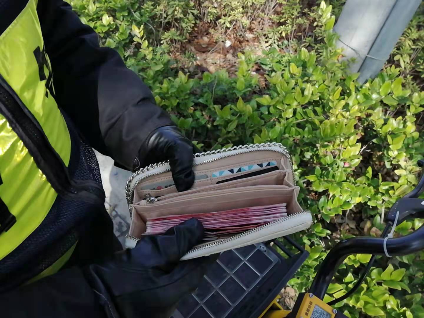當天13:22,徐金雷、李旭龍巡邏至浦東北路時(shí),看到路邊的小黃車(chē)亂停亂放,正當他們準備將小黃車(chē)停好時(shí),忽然發(fā)現一輛小黃車(chē)的車(chē)筐內有一個(gè)白色錢(qián)包。
