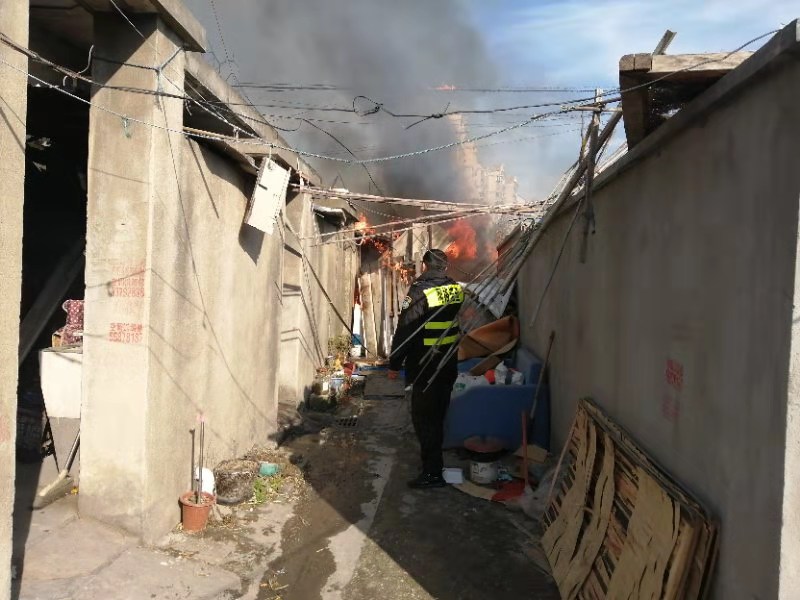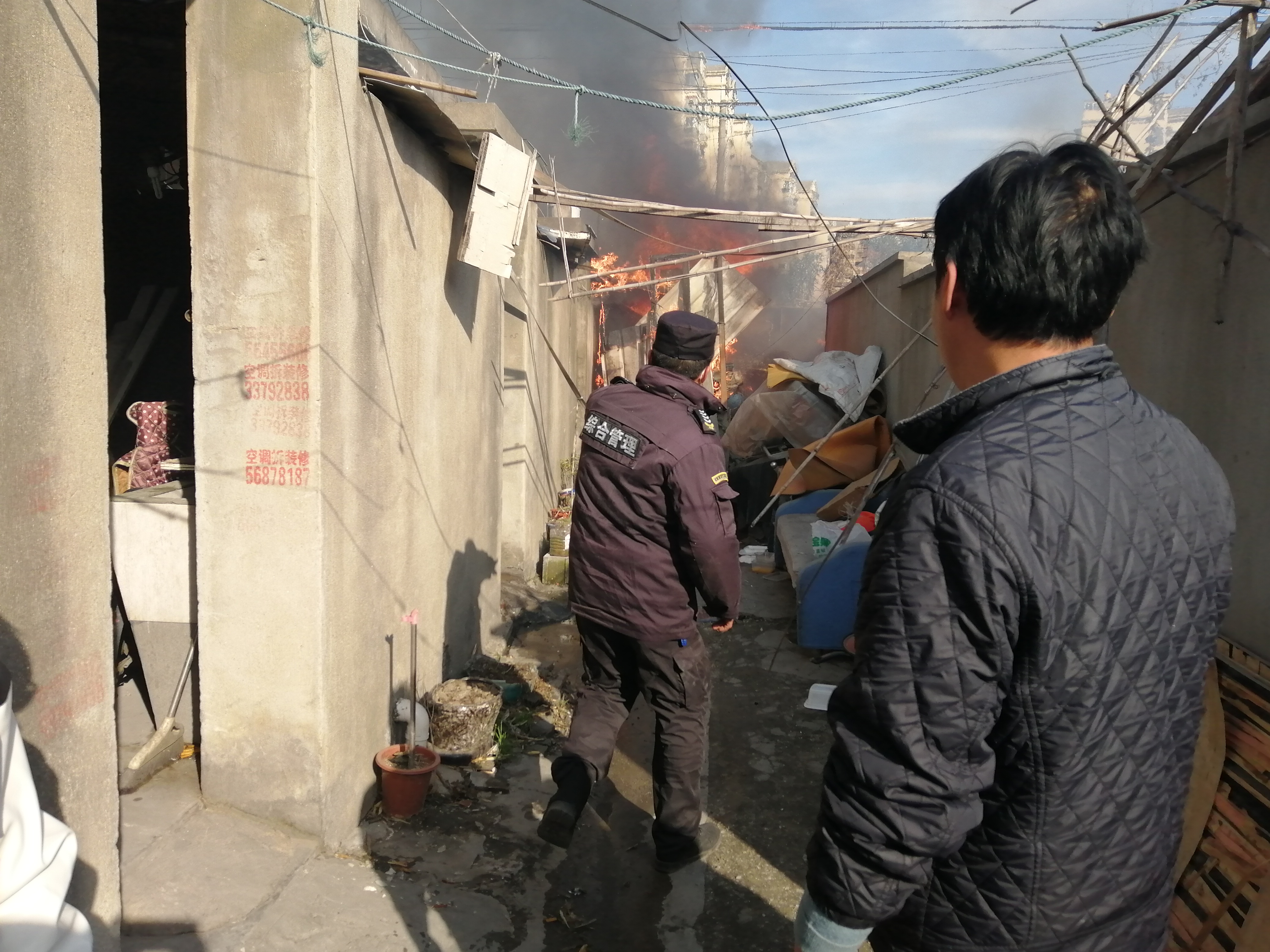 當天12:40,王如龍、王金齊、李旭龍三人巡邏至浦東北路與草高支路路口時(shí),發(fā)現附近地塊里有濃煙冒起,便趕緊將電瓶車(chē)停好,上前查看。原來(lái)是有人點(diǎn)火燒干草,但由于當時(shí)風(fēng)大,把周?chē)母刹菀剂?,火勢很快蔓延到了附近居民區。