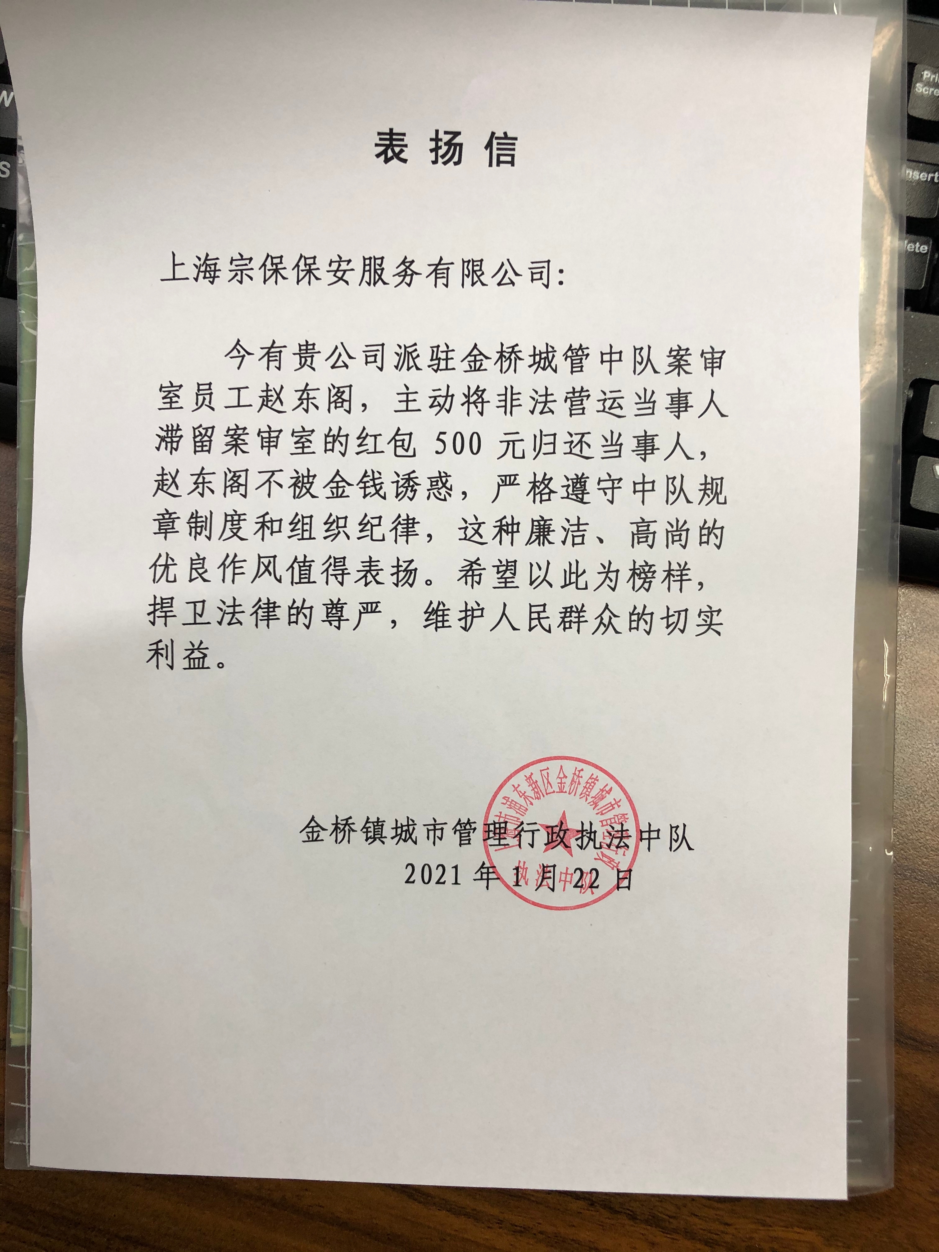 1月21日,宗保公司駐金橋市容項目收到金橋鎮城市管理行政執法中隊送來(lái)的一封表?yè)P信,信中表?yè)P了隊員趙東閣主動(dòng)將非法營(yíng)運車(chē)主留在案審室的500元紅包歸還當事人的事情。
