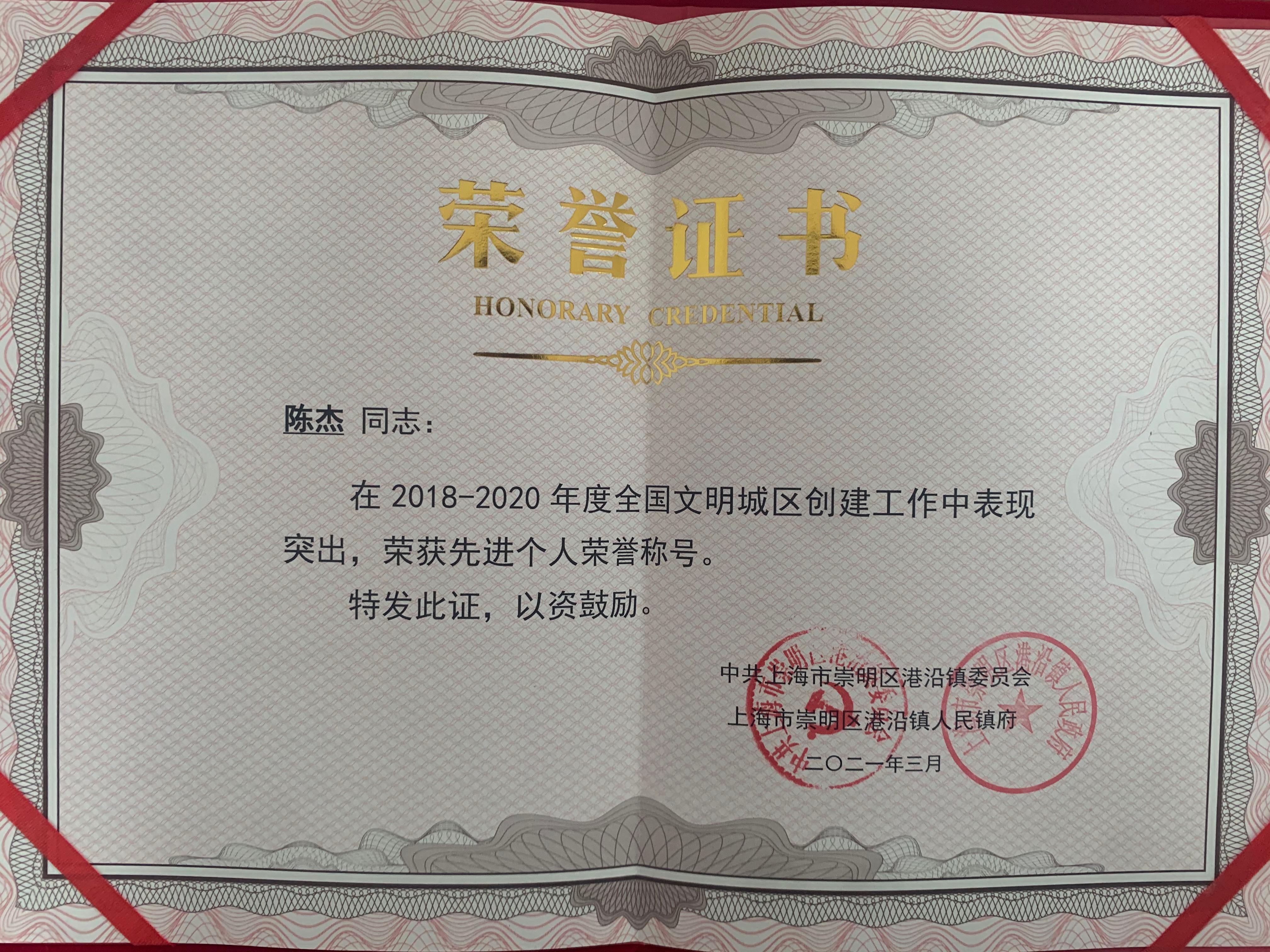 宗保公司駐港沿項目負責人陳杰在2018-2020年度全國文明城區創(chuàng )建工作中表現突出,榮獲先進(jìn)個(gè)人榮譽(yù)稱(chēng)號。