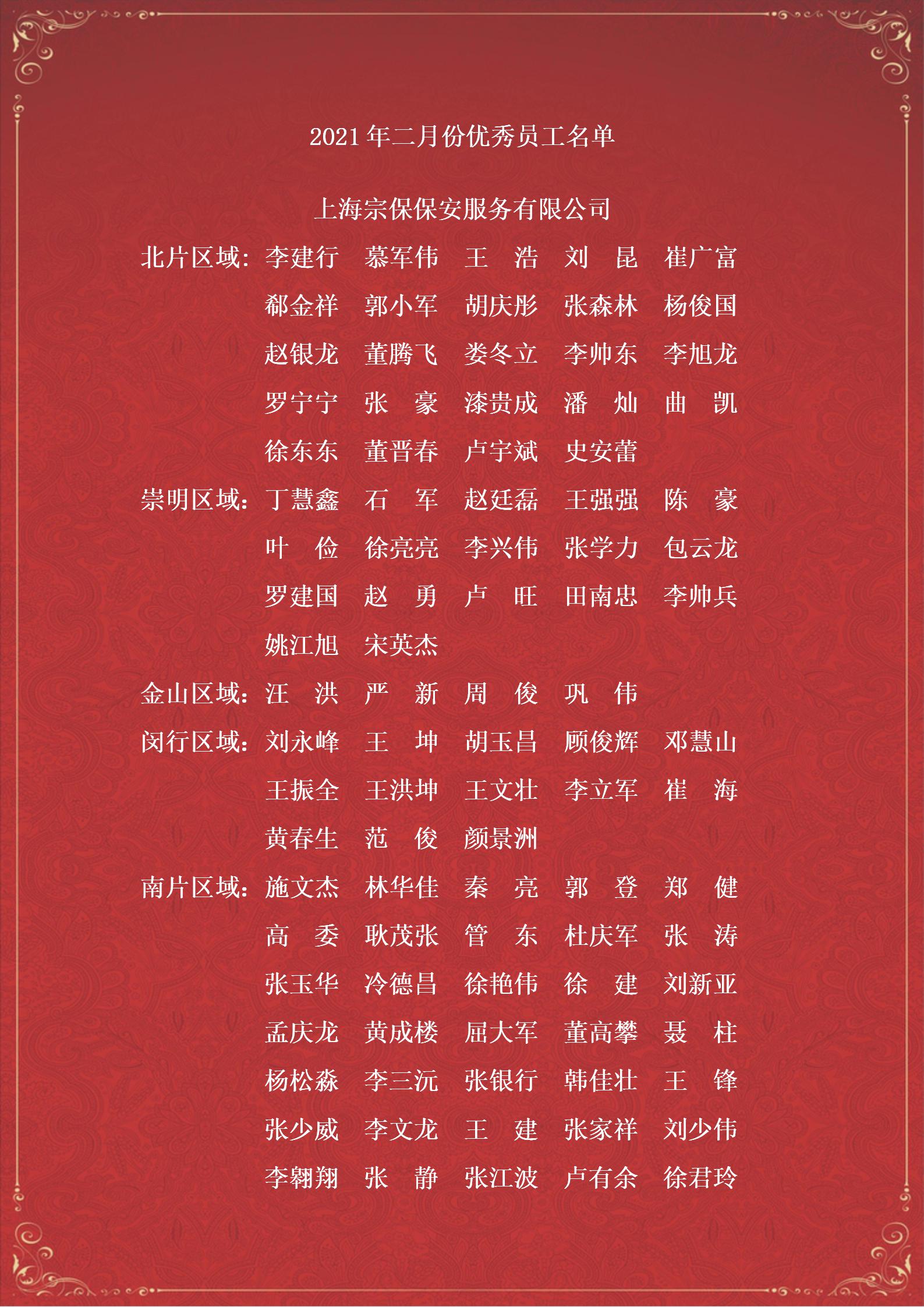 二月份正值2021年新春佳節,廣大員工響應“疫情防控非必要不返鄉”的號召,舍棄與家人團聚,不分心不走神,按照甲方的要求,服從公司的部署,凝心聚力,積極投入到各項輔助安全保障、市容協(xié)管工作之中,期間涌現出了一批表現突出的優(yōu)秀個(gè)人。為表彰先進(jìn),樹(shù)立典型,激勵后進(jìn),在各項目推薦,各部門(mén)審定把關(guān)的基礎上,經(jīng)公司董事會(huì )研究,決定對2月份工作表現優(yōu)異的李建行等157名優(yōu)秀員工,予以通報表彰獎勵(獎金已隨二月份工資發(fā)放)。
