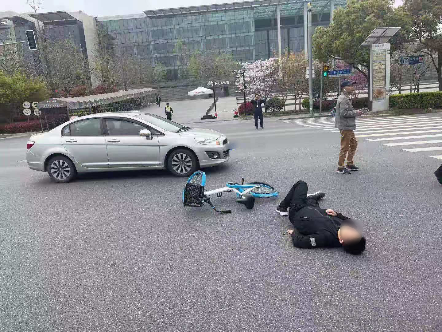 當天9:10左右,盧迎輝在新金橋路金蘇路華為南門(mén)早高峰值勤時(shí),遇到一起交通事故,一位騎單車(chē)的男子與行駛中的小轎車(chē)相撞,男子當即被撞出去三四米遠,倒在地上抽搐不止。