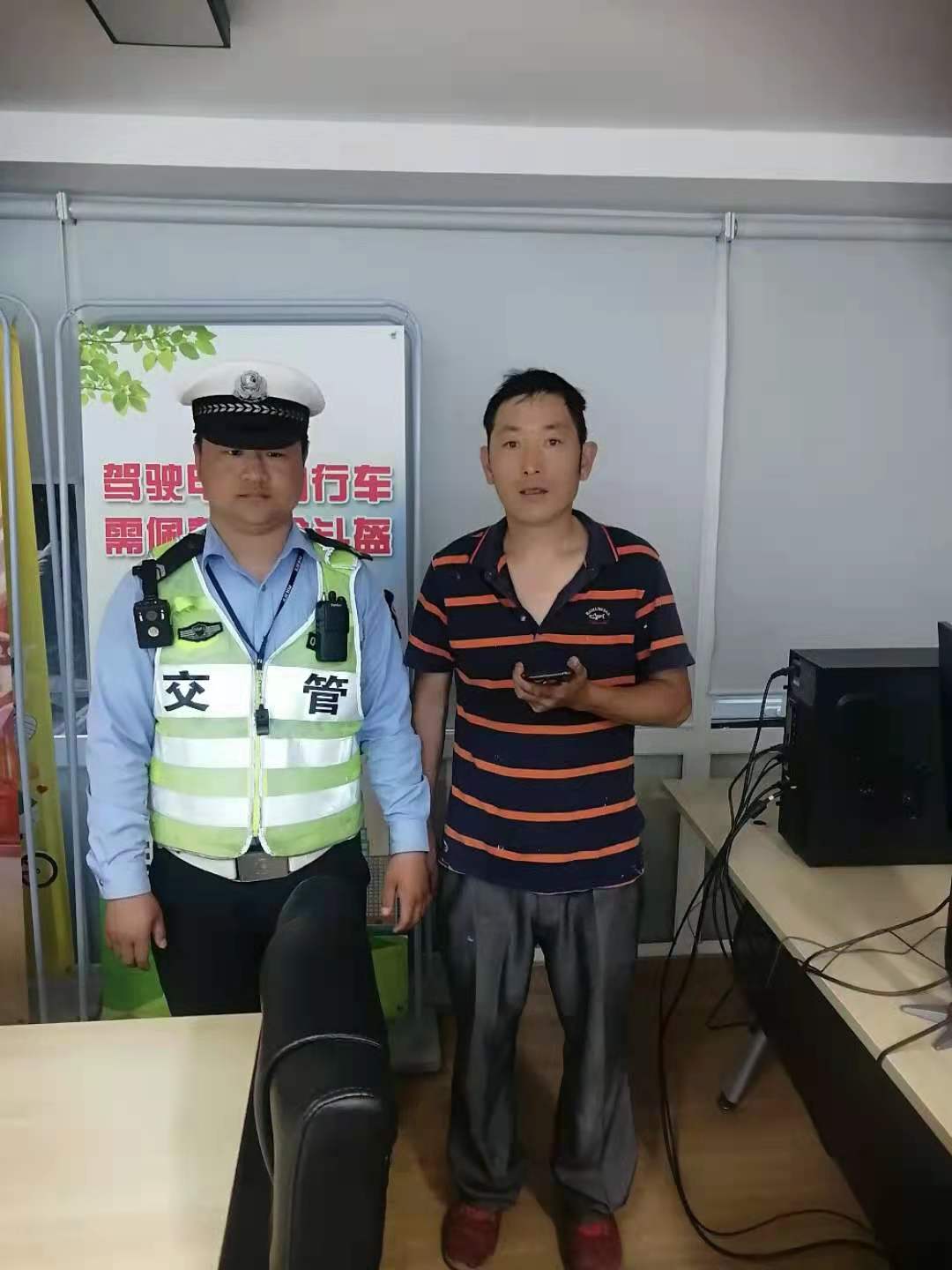 隨后,馮焱將情況上報當班領(lǐng)導,并按指示將手機帶到值勤交通崗亭。過(guò)了很久,一男子打來(lái)電話(huà),說(shuō)自己手機丟了,馮焱就和他約好碰面地點(diǎn)。