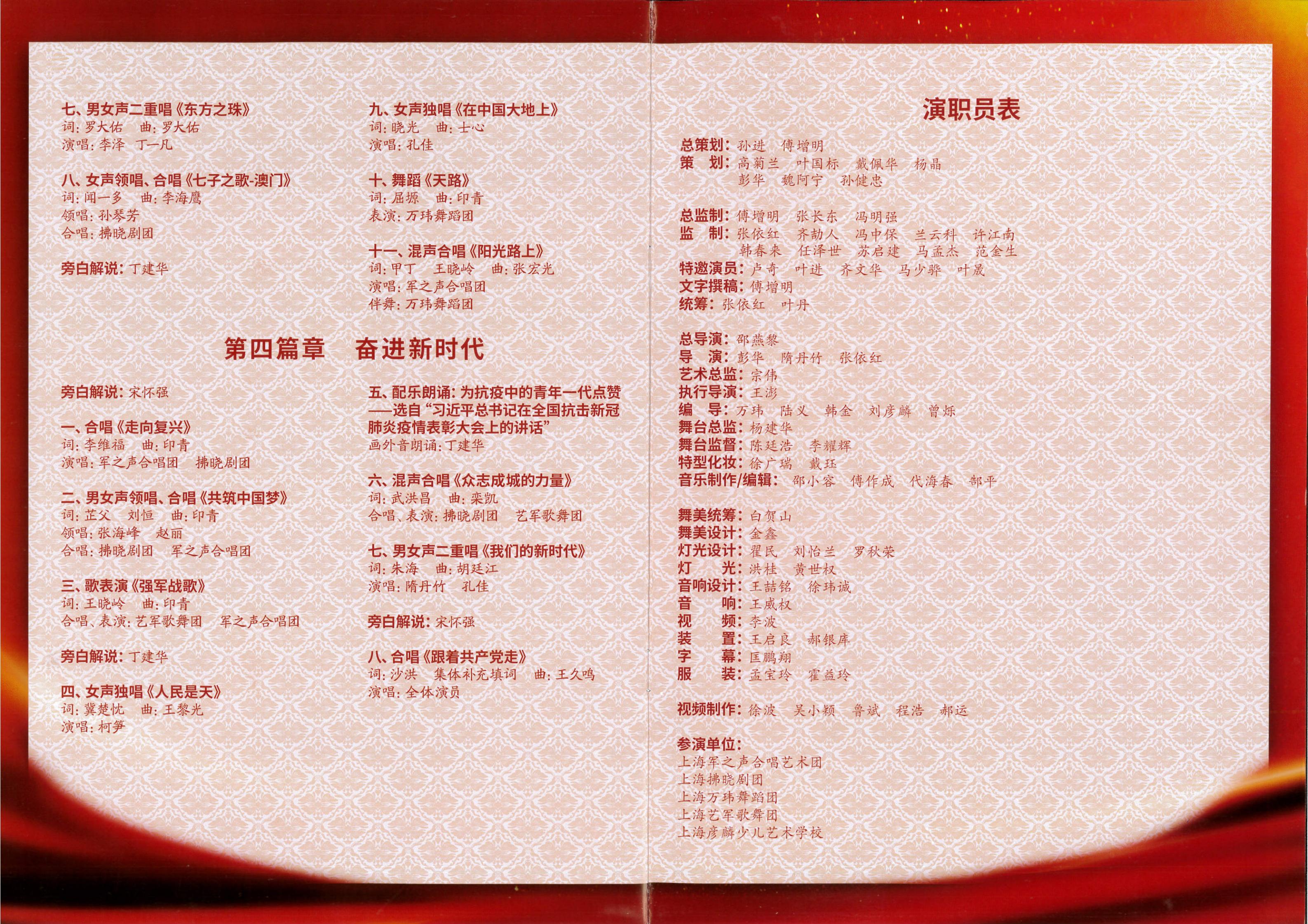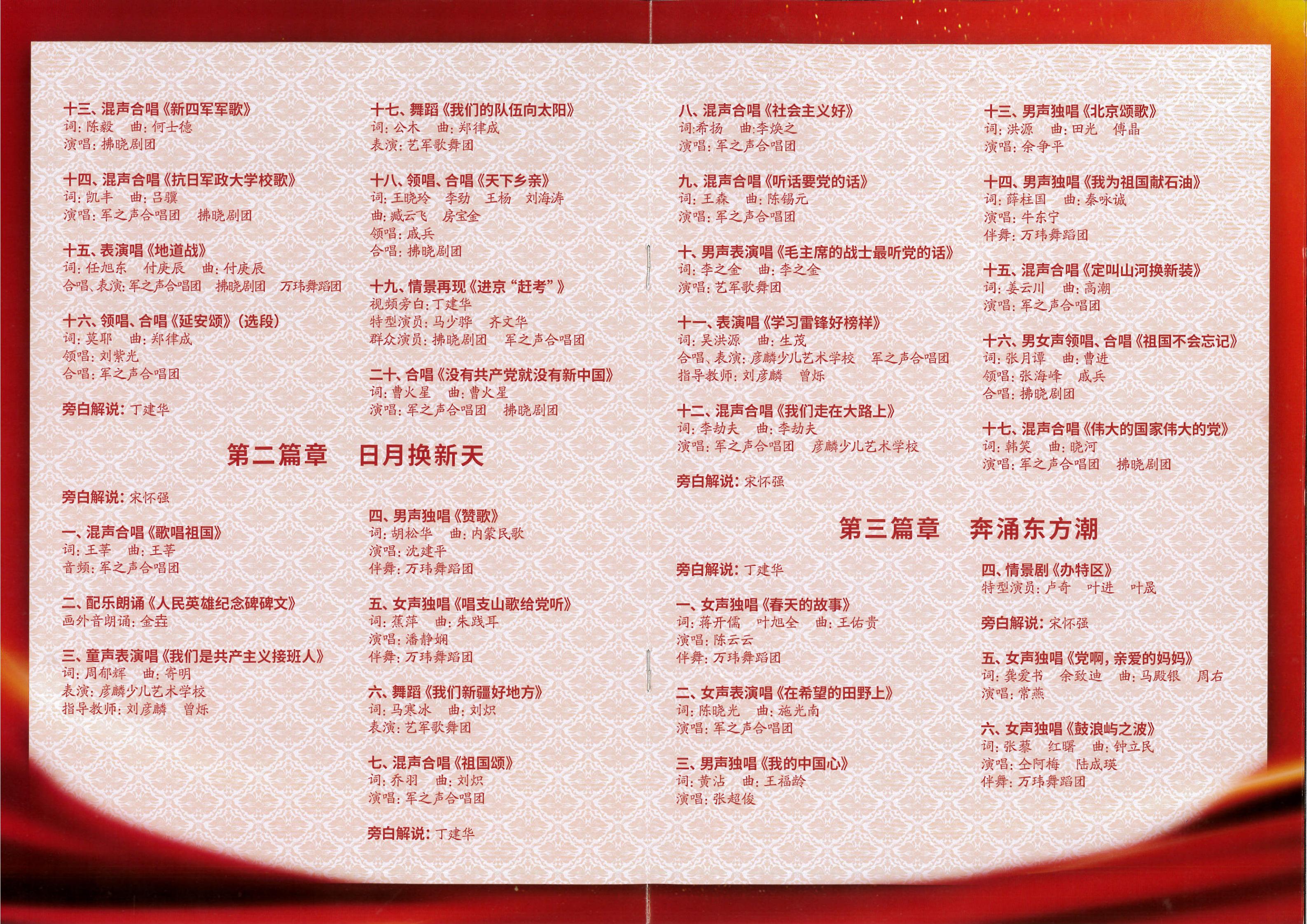 演出從6月8日開(kāi)始至6月10日結束,包含四個(gè)篇章:“崢嶸歲月稠”“日月?lián)Q新天”“奔涌東方潮”“奮進(jìn)新時(shí)代”,分別反映了黨在新民主主義革命、社會(huì )主義革命和建設時(shí)期,改革開(kāi)放和中國特色社會(huì )主義進(jìn)入新時(shí)代這四個(gè)階段,團結帶領(lǐng)中國人民不斷從勝利走向勝利的光輝歷程。