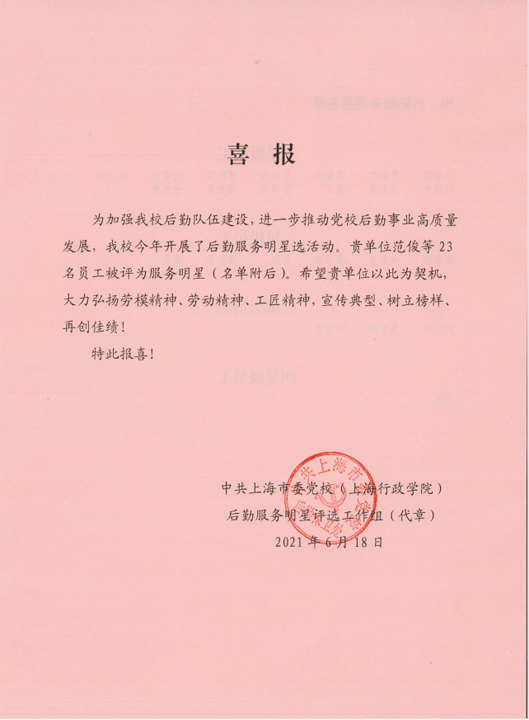 為大力弘揚勞模精神、勞動(dòng)精神、工匠精神,表彰先進(jìn)、樹(shù)立榜樣、再創(chuàng )佳績(jì),以良好的精神風(fēng)貌迎接中國共產(chǎn)黨成立100周年,6月28日,中共上海市委黨校(上海行政學(xué)院)對一批后勤服務(wù)先進(jìn)典型進(jìn)行表彰。宗保公司范俊等23名員工被評為2021年校院后勤服務(wù)明星。