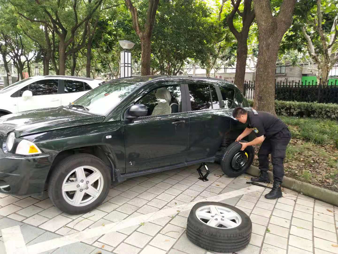 當天7:00,項目組長(cháng)許志剛在校內巡邏時(shí),發(fā)現北門(mén)停車(chē)場(chǎng)有位男子一直在徘徊,便立即上前詢(xún)問(wèn)。原來(lái)這位男子是來(lái)黨校參加“哲社班”培訓的學(xué)員,車(chē)子后輪被釘子扎破,完全沒(méi)氣無(wú)法行走,一時(shí)找不到維修師傅,心理十分著(zhù)急。