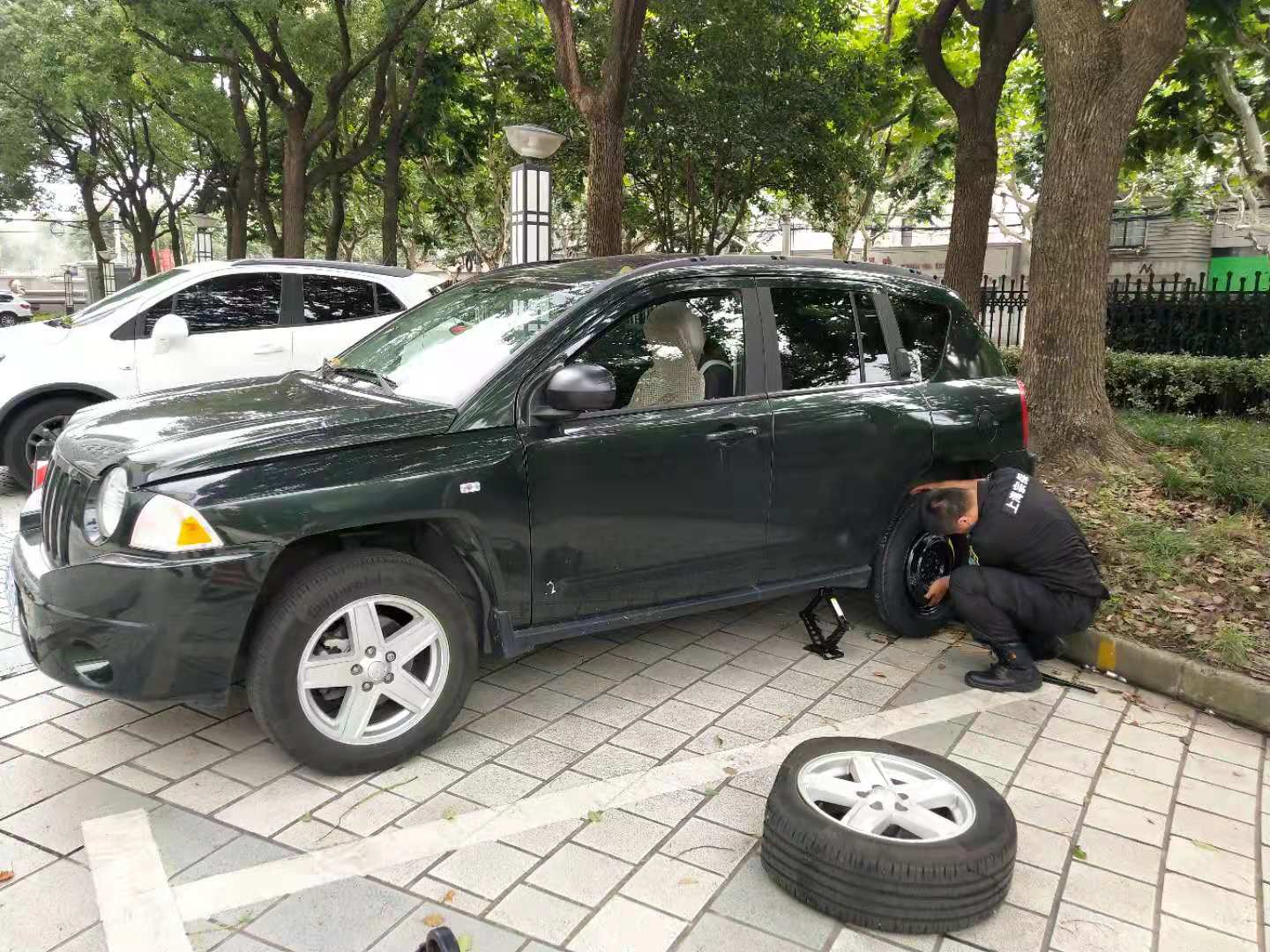 輪胎扎釘無(wú)法行 隊員換胎解難題—市委黨校項目隊員幫助黨校學(xué)員更換車(chē)備胎