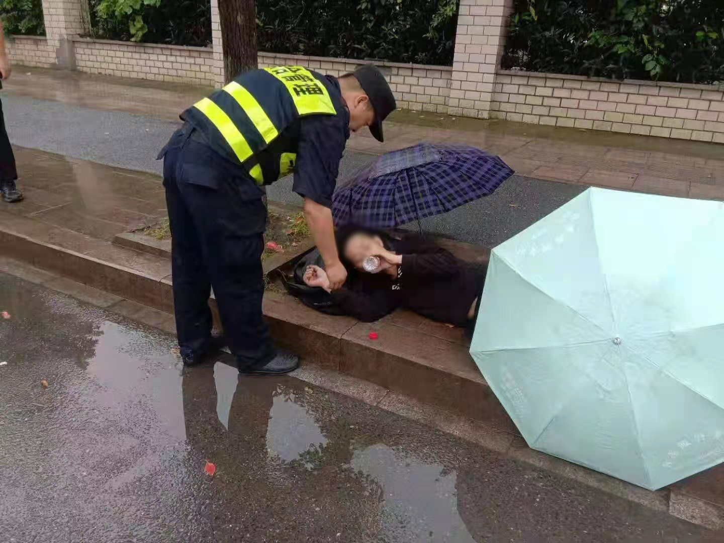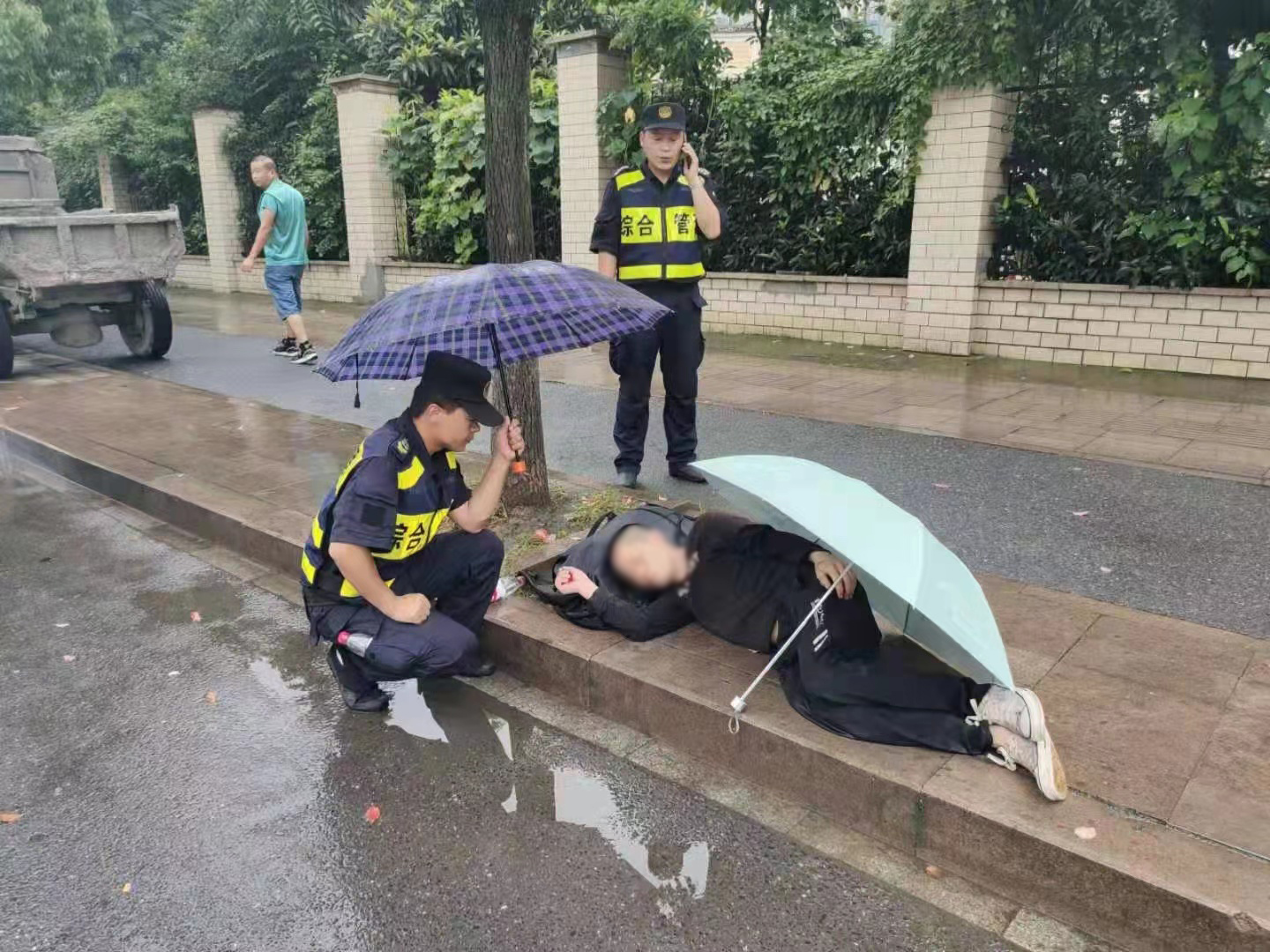 張騰剛走近男子就聞到一股濃烈的酒味,呂劍強嘗試叫醒男子,但醉酒男子沒(méi)有反應。此時(shí)正在下雨,兩人便撐起雨傘為其遮雨,并將情況向組長(cháng)報告。