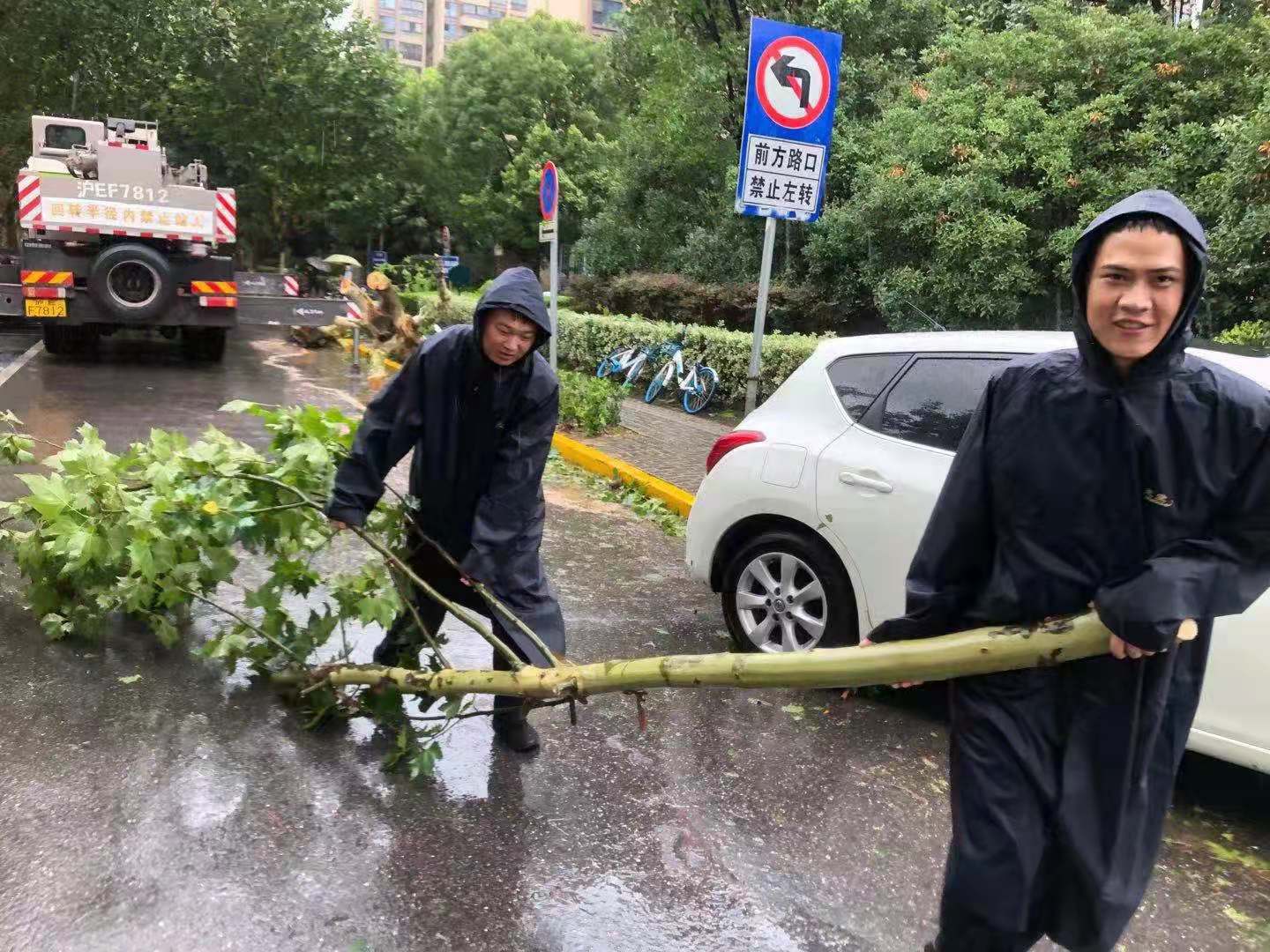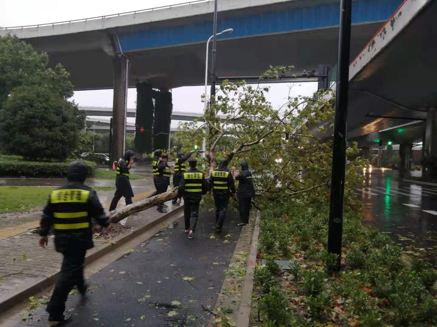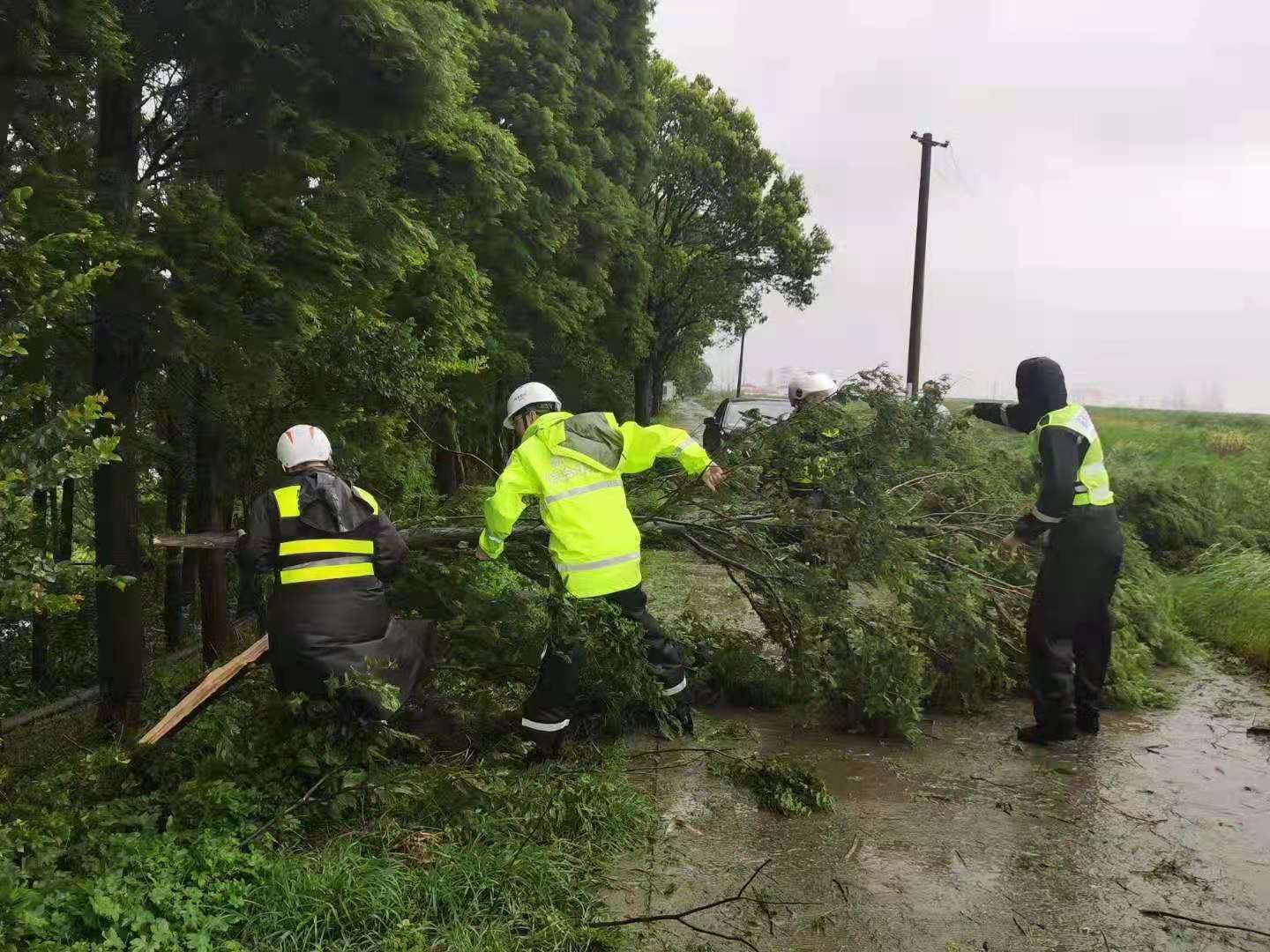 馬路兩旁,宗保隊員利用大風(fēng)暫停間隙,清理傾倒的樹(shù)木。