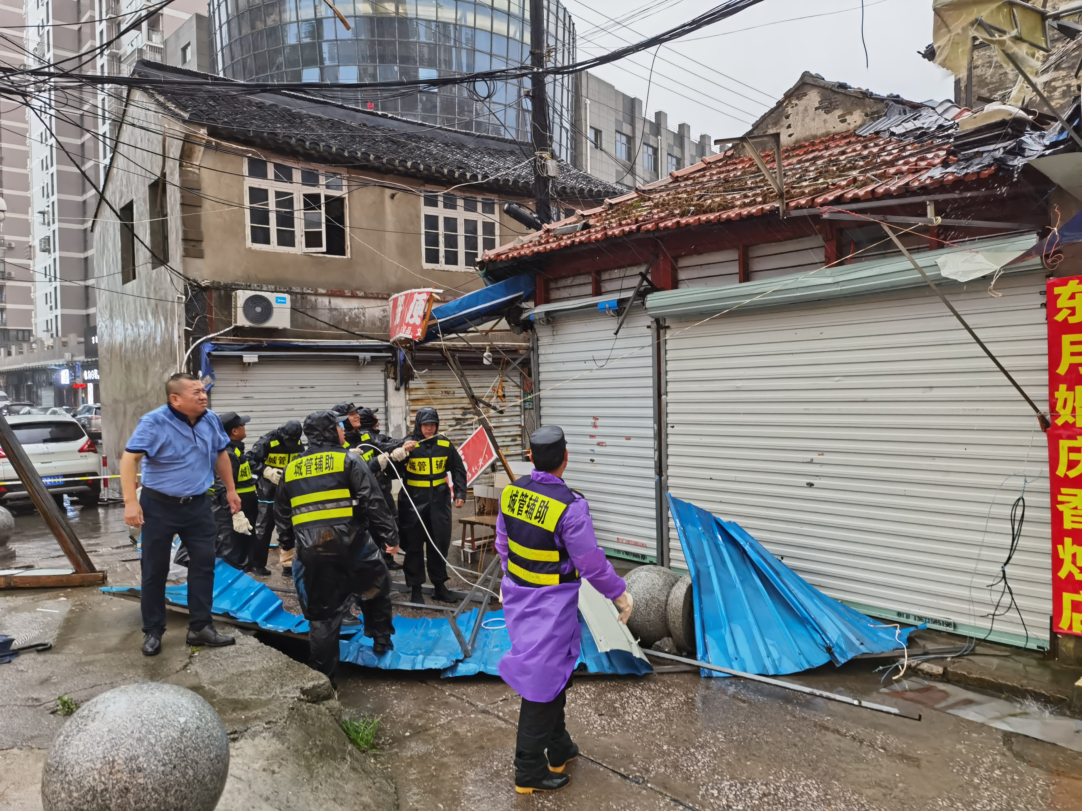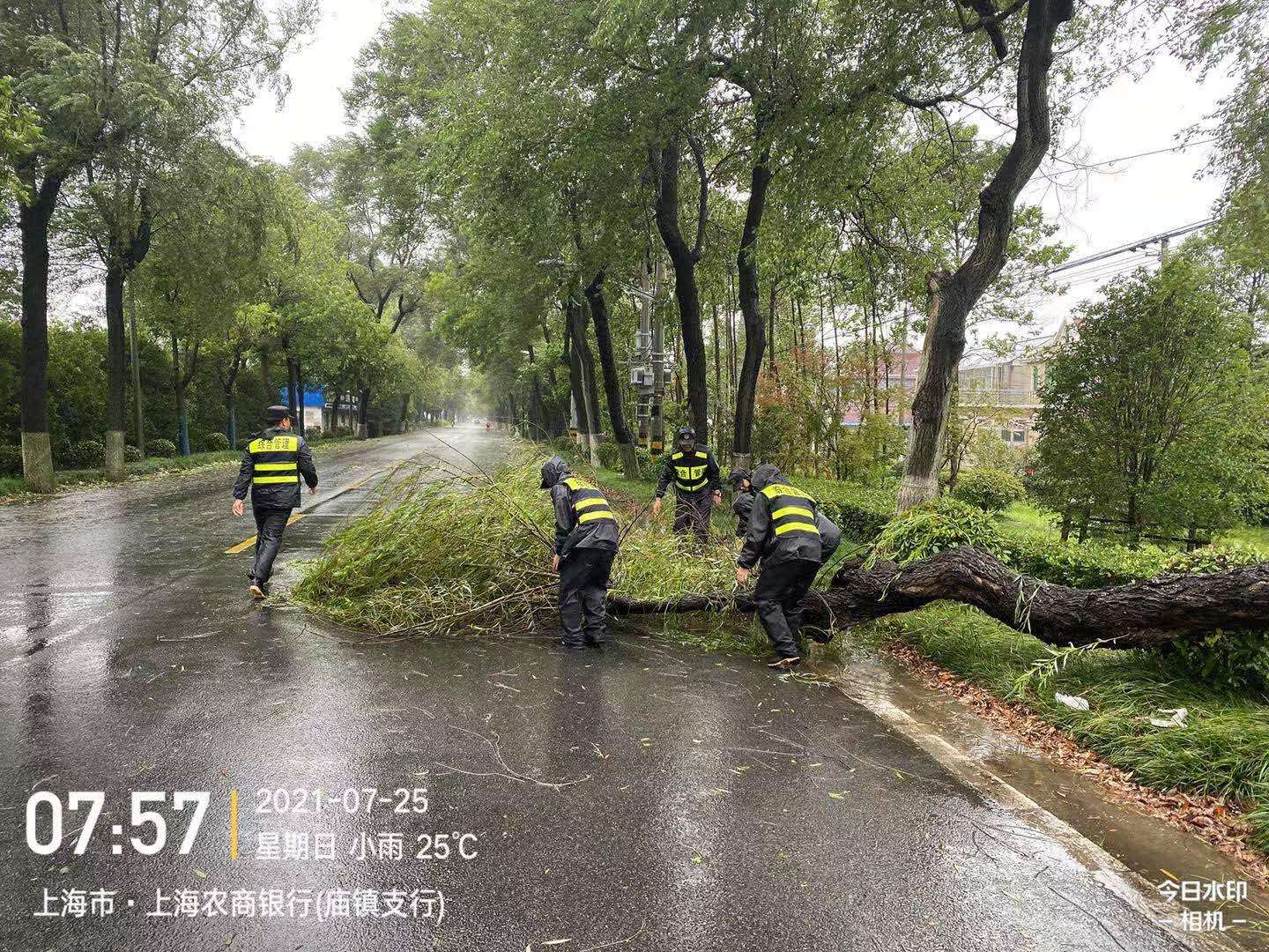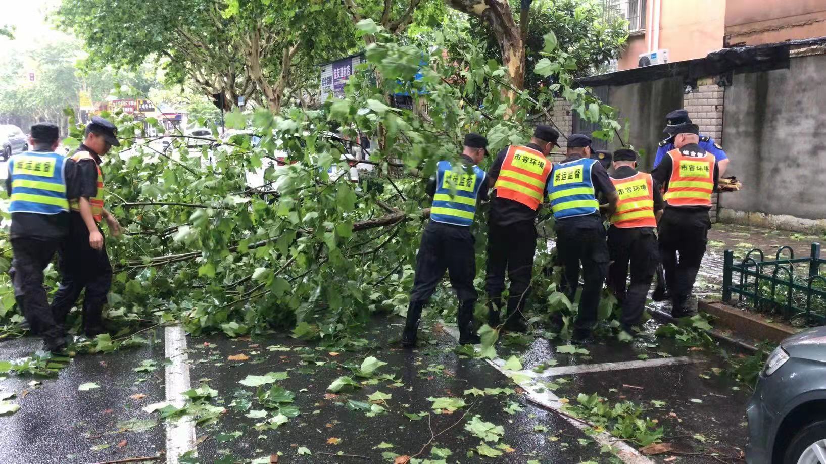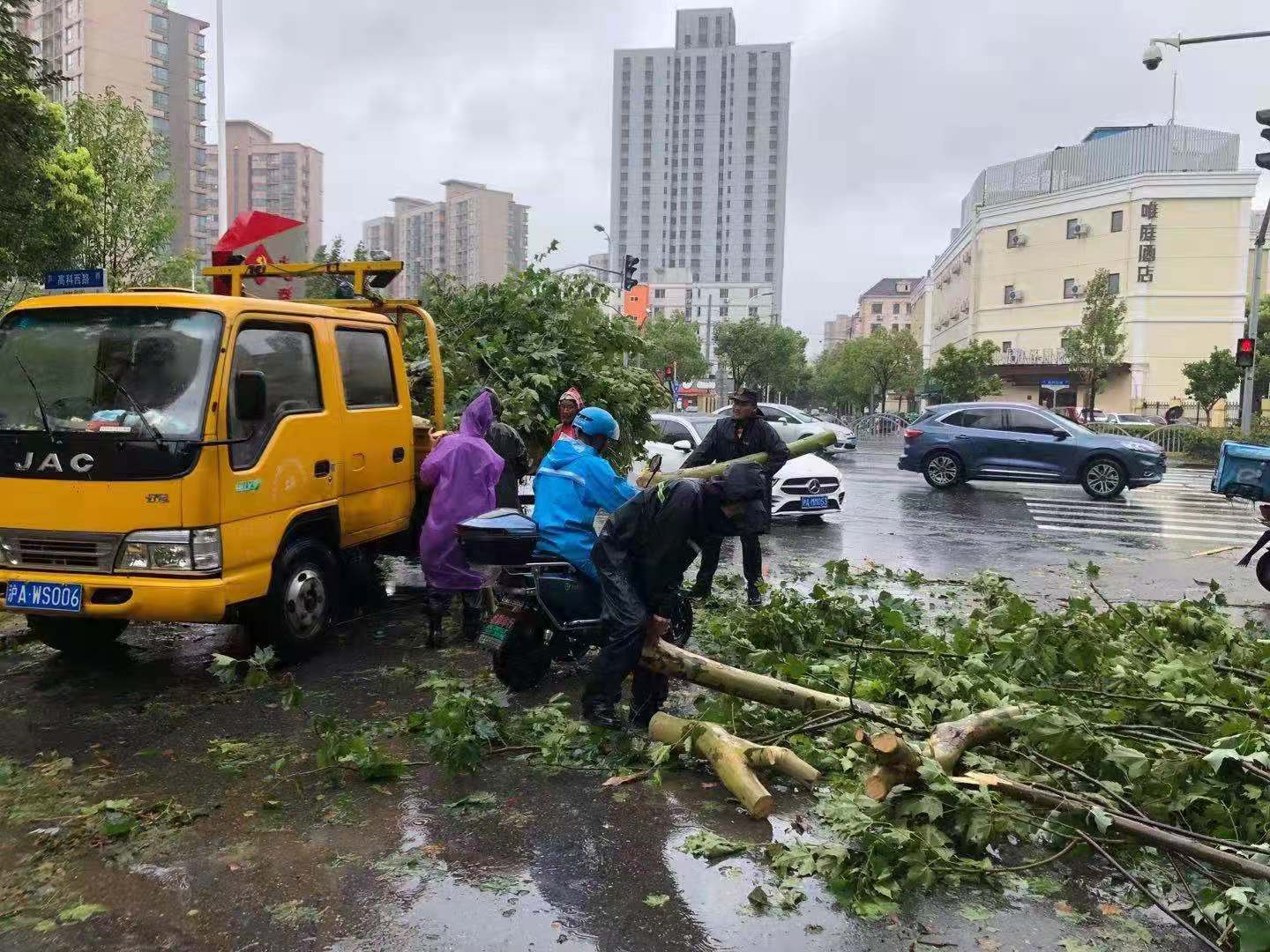 馬路兩旁,宗保隊員利用大風(fēng)暫停間隙,清理傾倒的樹(shù)木。