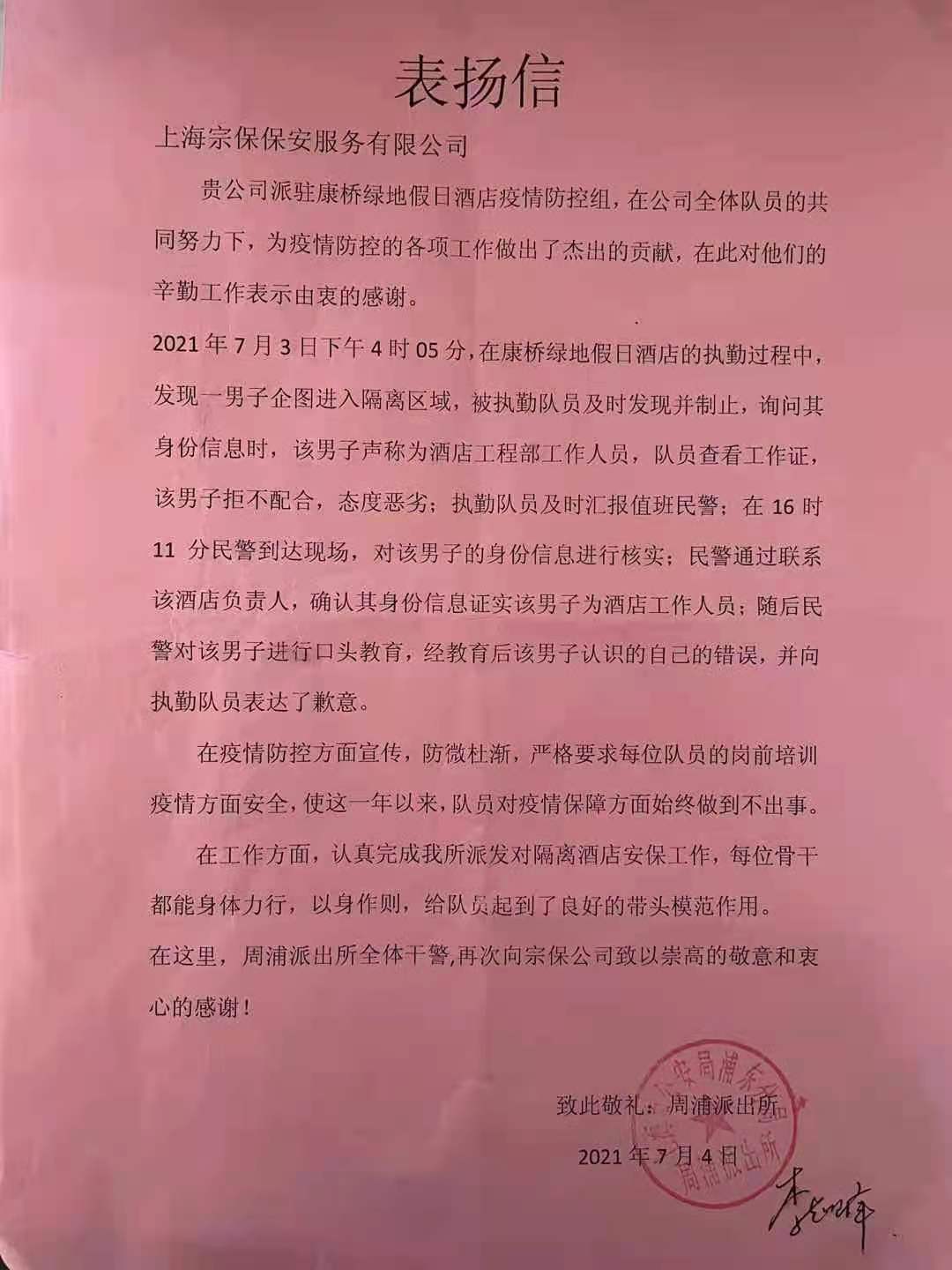 7月4日,宗保公司駐周浦輔警項目收到周浦派出所送來(lái)的一封表?yè)P信,信中對公司駐疫情防控組全體隊員的辛勤付出提出表?yè)P。