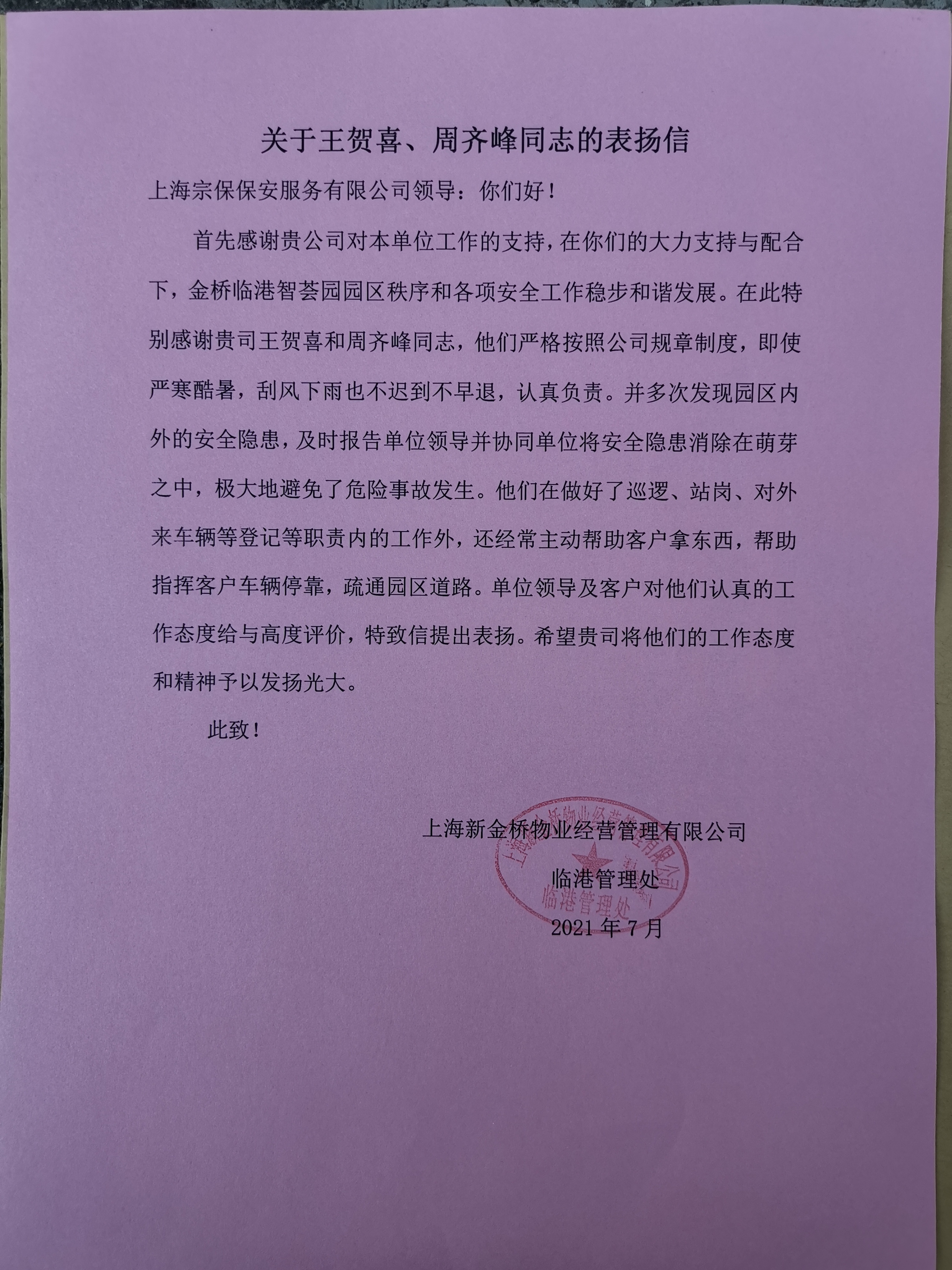 7月14日,宗保公司駐金橋臨港智薈園項目收到上海新金橋物業(yè)經(jīng)營(yíng)管理有限公司送來(lái)的一封表?yè)P信,信中對王賀喜、周齊峰兩名隊員提出表?yè)P。