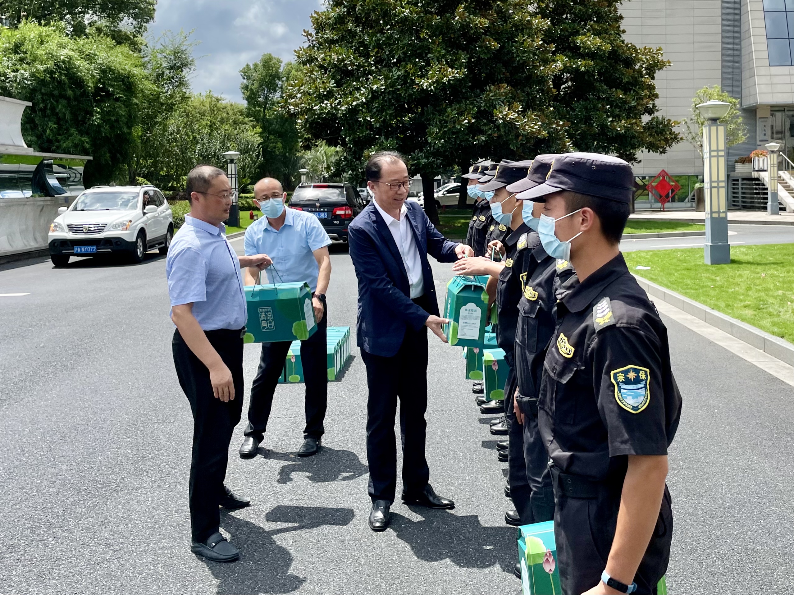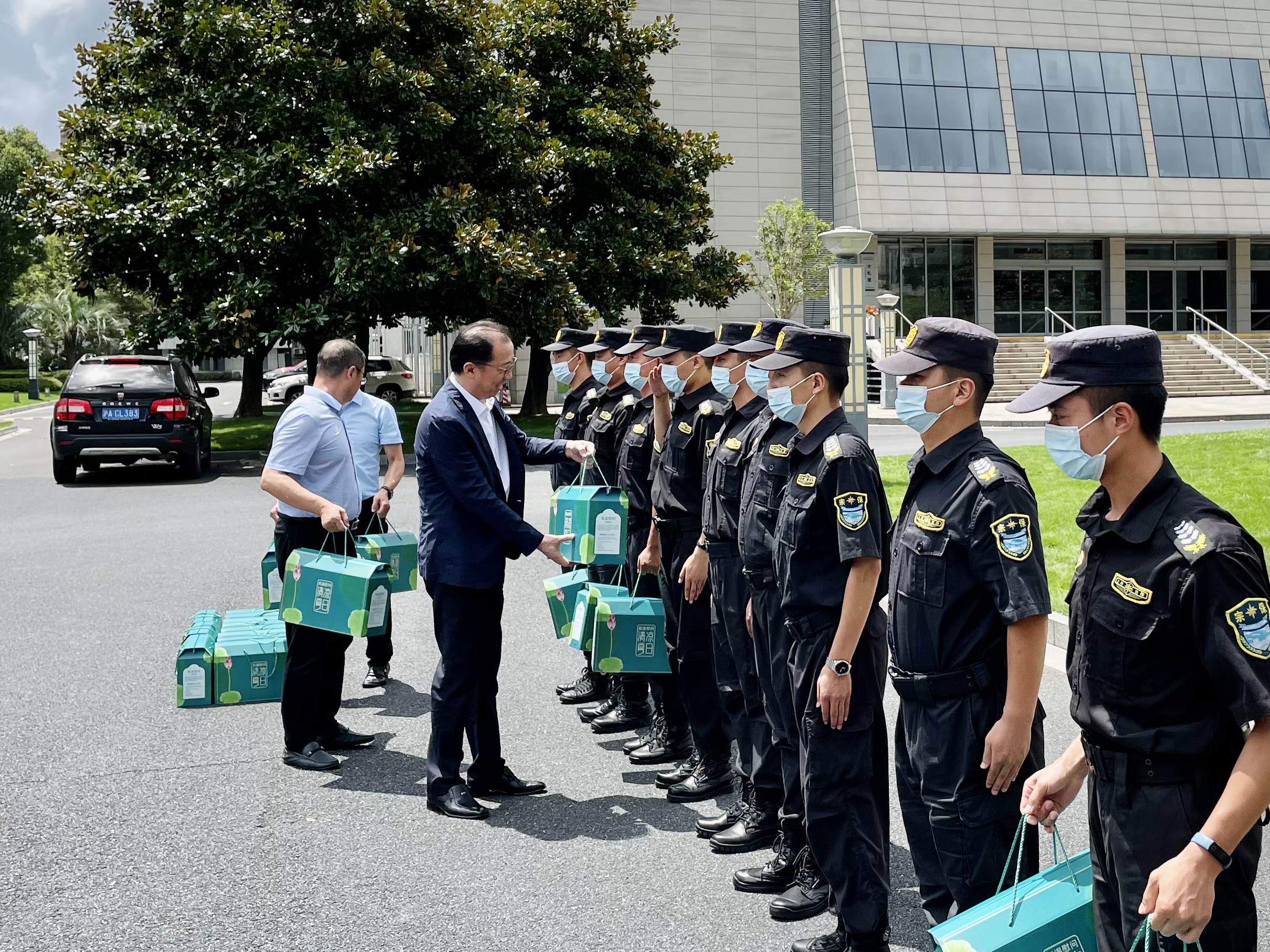 楊躍毅秘書(shū)長(cháng)代表上海市保安服務(wù)行業(yè)協(xié)會(huì ),給隊員們送上了防暑降溫用品,對持續高溫天氣下,不畏酷暑、履職盡責,堅守崗位、敢于擔當,依然堅守在戶(hù)外值勤的宗保隊員們給予充分肯定,叮囑大家疫情防控要慎終如始不松懈,科學(xué)合理安排好休息,做好防暑降溫工作,確保身體健康。