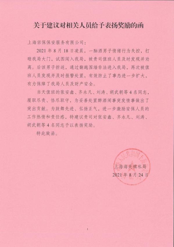 8月24日,上海海關(guān)緝私局給宗保公司駐上海海關(guān)緝私局項目送來(lái)一封建議表?yè)P獎勵的函,函中對公司工作警惕細致、恪盡職守的4名隊員提出特別表?yè)P。