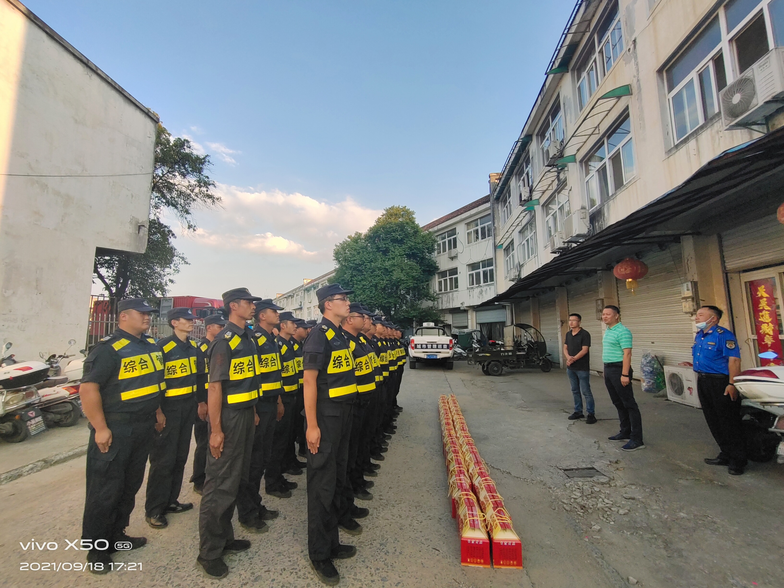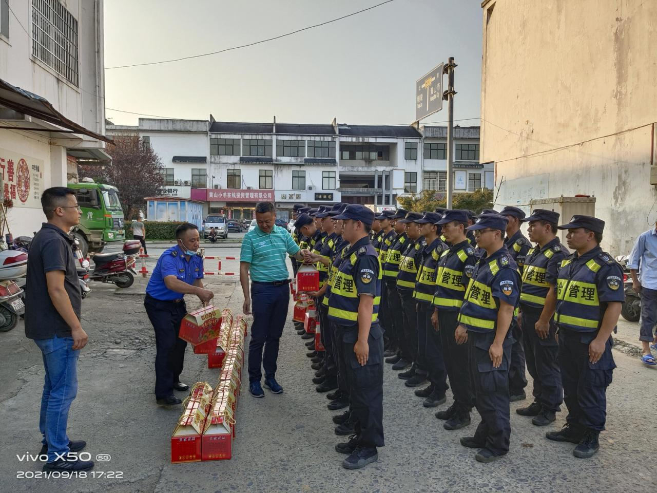 9月18日下午,黃山區城市管理行政執法局局長(cháng)汪雷春、副局長(cháng)王磊、中隊長(cháng)曹太平一行慰問(wèn)宗保公司駐黃山區太平市容項目隊員。