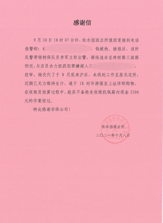 10月15日,浦東新區依水園派出所副所長(cháng)張嘯天和民警錢(qián)堅強將一面繡有“優(yōu)質(zhì)服務(wù) 為民解憂(yōu)”的錦旗和一封感謝信,送到宗保公司副總經(jīng)理王耀和隊員李軍的手上,表?yè)P宗保隊員李軍在抓獲犯罪嫌疑人中機智果敢的行為。