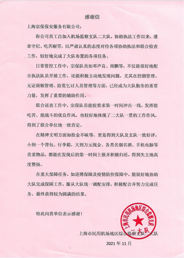 11月15日,宗保公司駐機場(chǎng)防疫項目收到上海市民用機場(chǎng)地區綜合監察支隊二大隊送來(lái)的感謝信,信中對項目隊員們的良好工作表現給予了充分肯定。