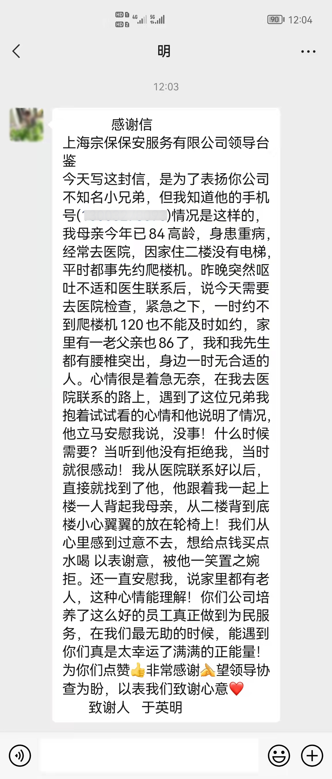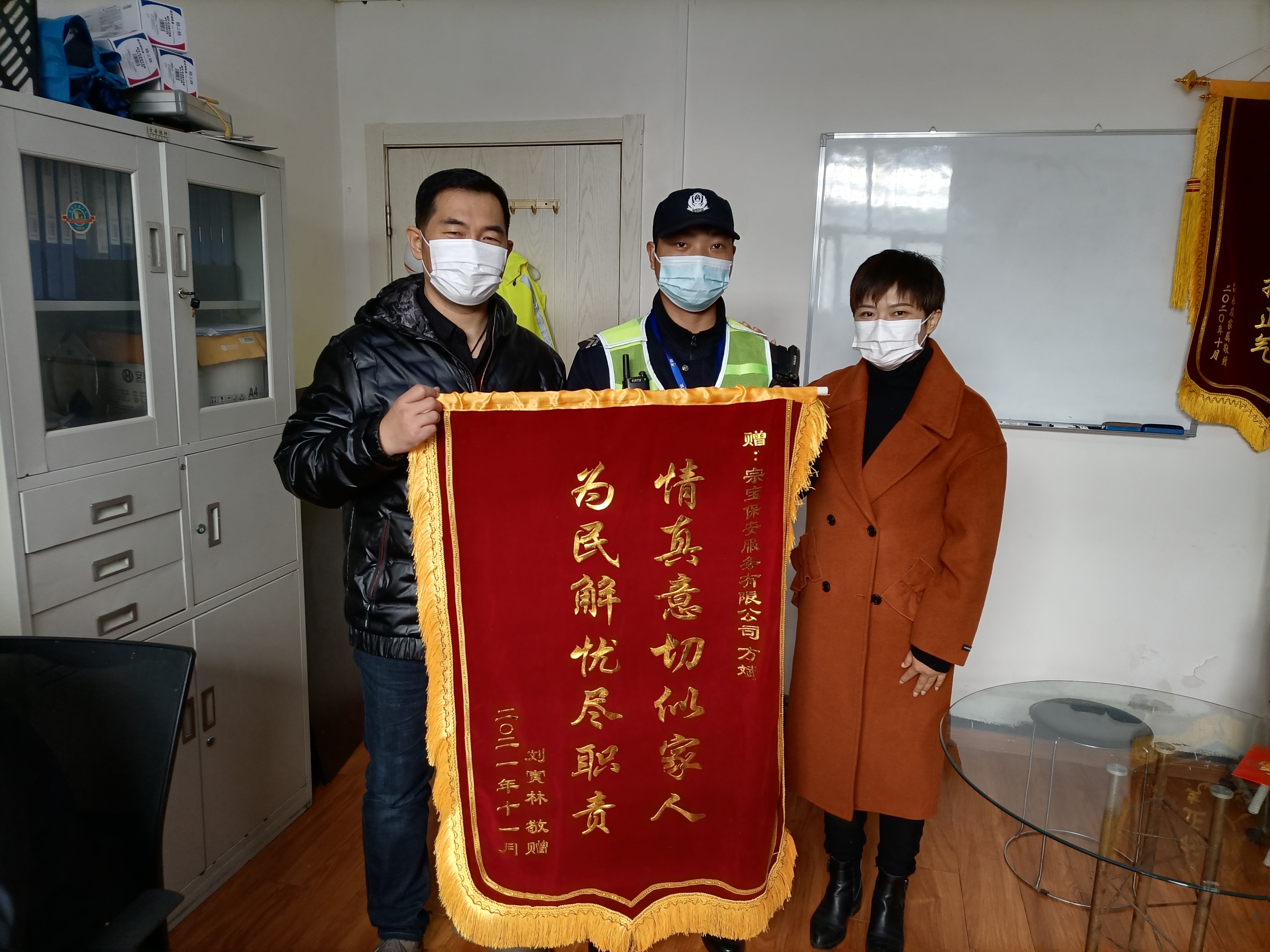 11月28日,宗保公司駐閔行莘莊梅隴輔警項目收到市民劉女士送來(lái)的一面繡有“為民解憂(yōu)盡職責 情真意切似家人”的錦旗和一封感謝信,感謝隊員方斌熱心助人的行為。