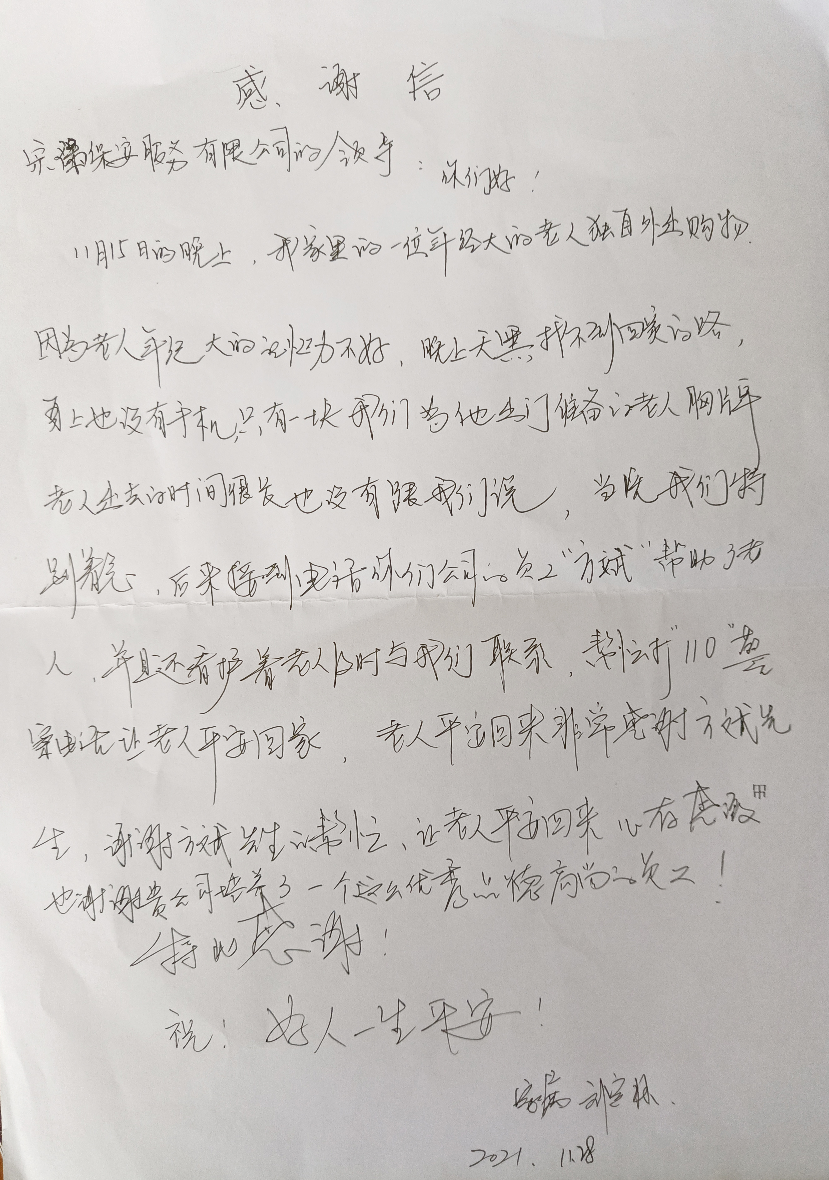 很快,民警趕到現場(chǎng),聯(lián)系了老人的家屬并將其送回家中。事后,老人家屬得知詳情,對宗保公司員工熱心助人的行為十分感謝,特意送來(lái)錦旗和感謝信以表達家人的感激之情。
