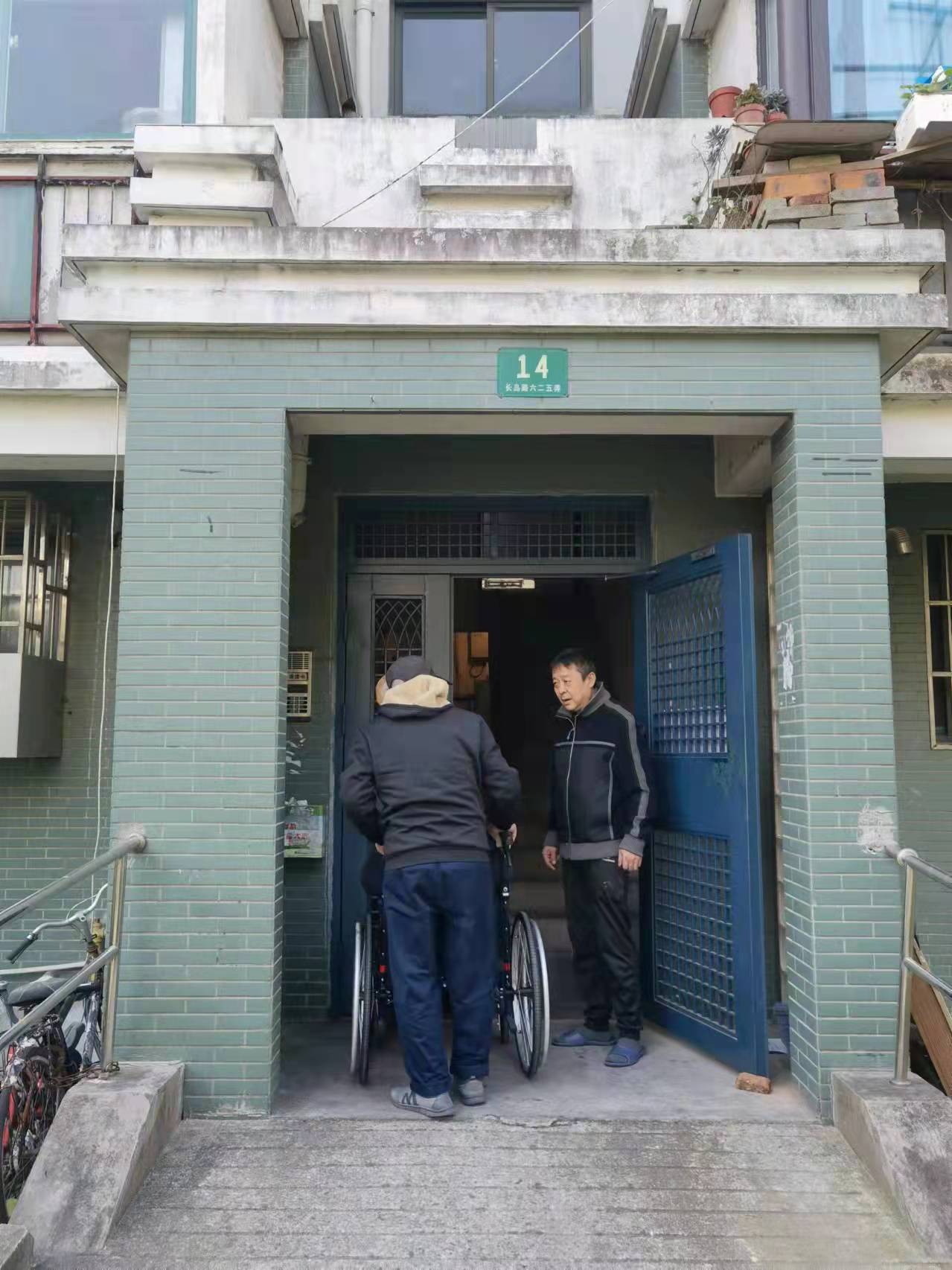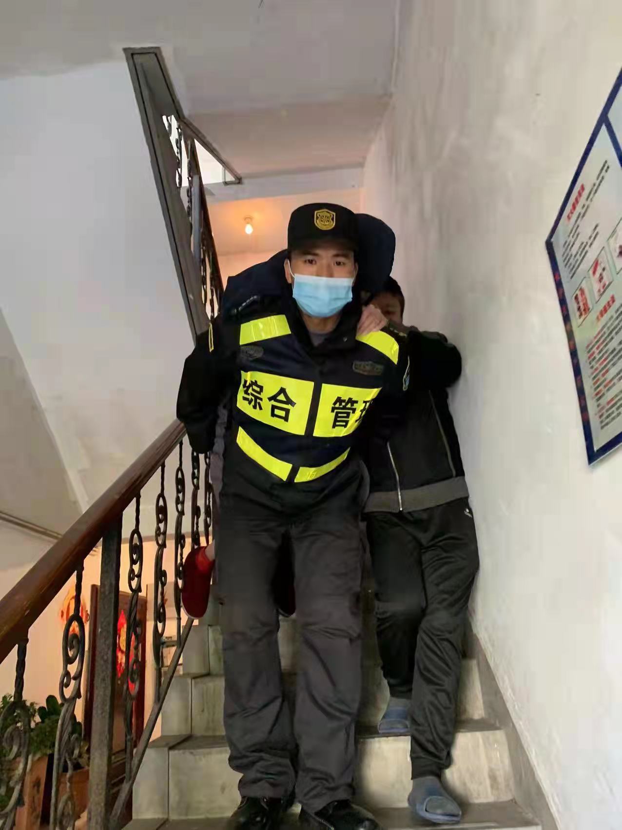 11月26日,宗保公司駐滬東市容項目隊員幫忙背老人下樓就醫。
