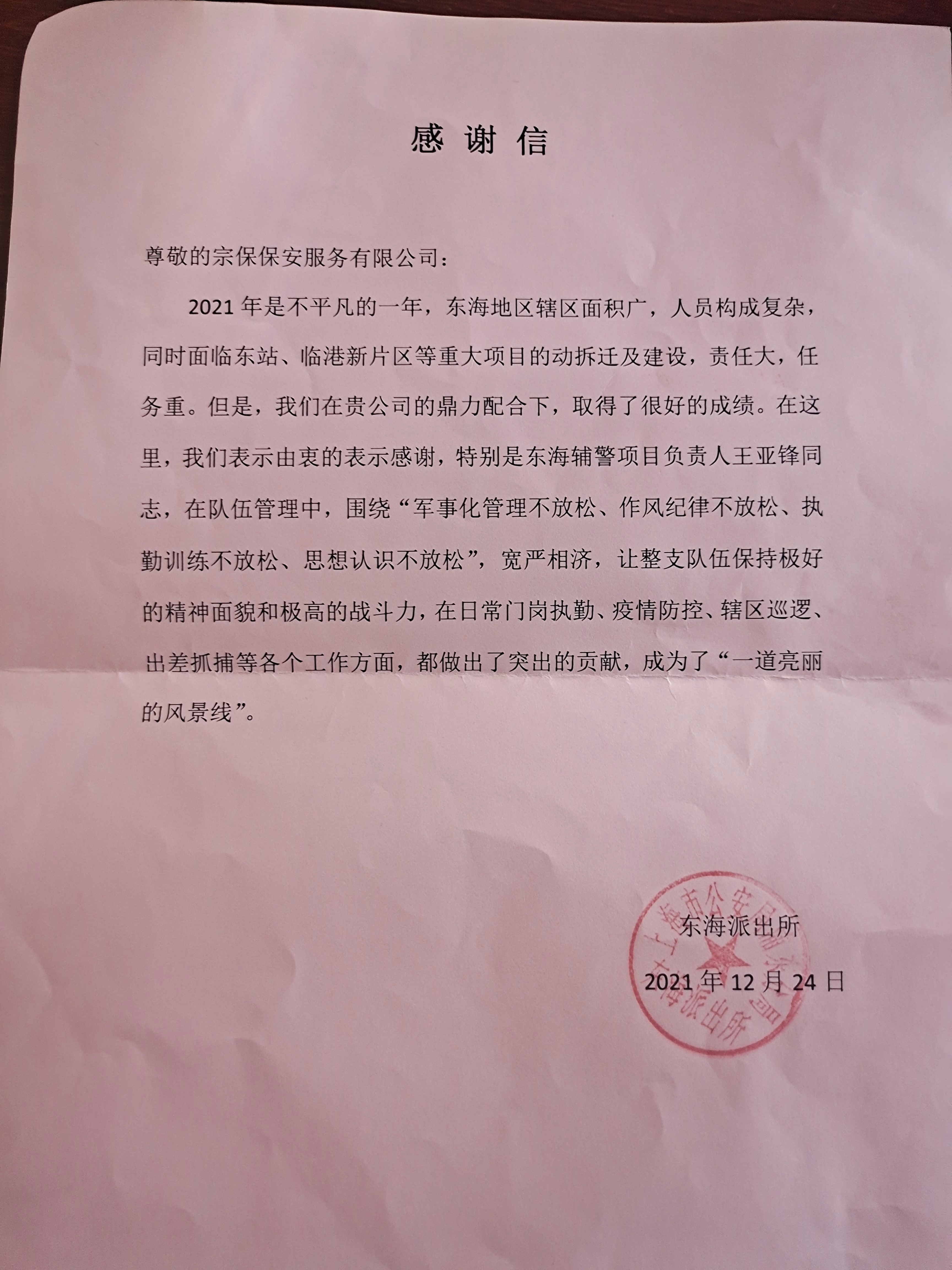 12月24日,宗保公司駐東海派出所輔警項目收到東海派出所的感謝信,信中表?yè)P宗保隊員王亞鋒出色的工作表現。