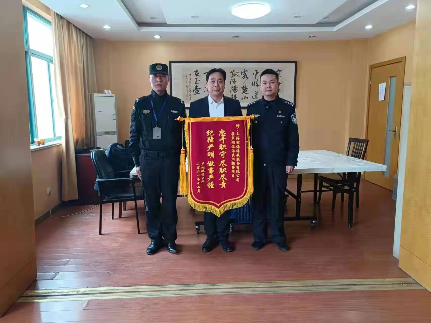 12月28日,宗保公司駐臨港蘆潮港輔警項目收到蘆潮港派出所贈送的一面繡有“忠于職守盡職盡責 紀律嚴明做事嚴謹”的錦旗,充分肯定宗保隊員履職盡責的工作表現。