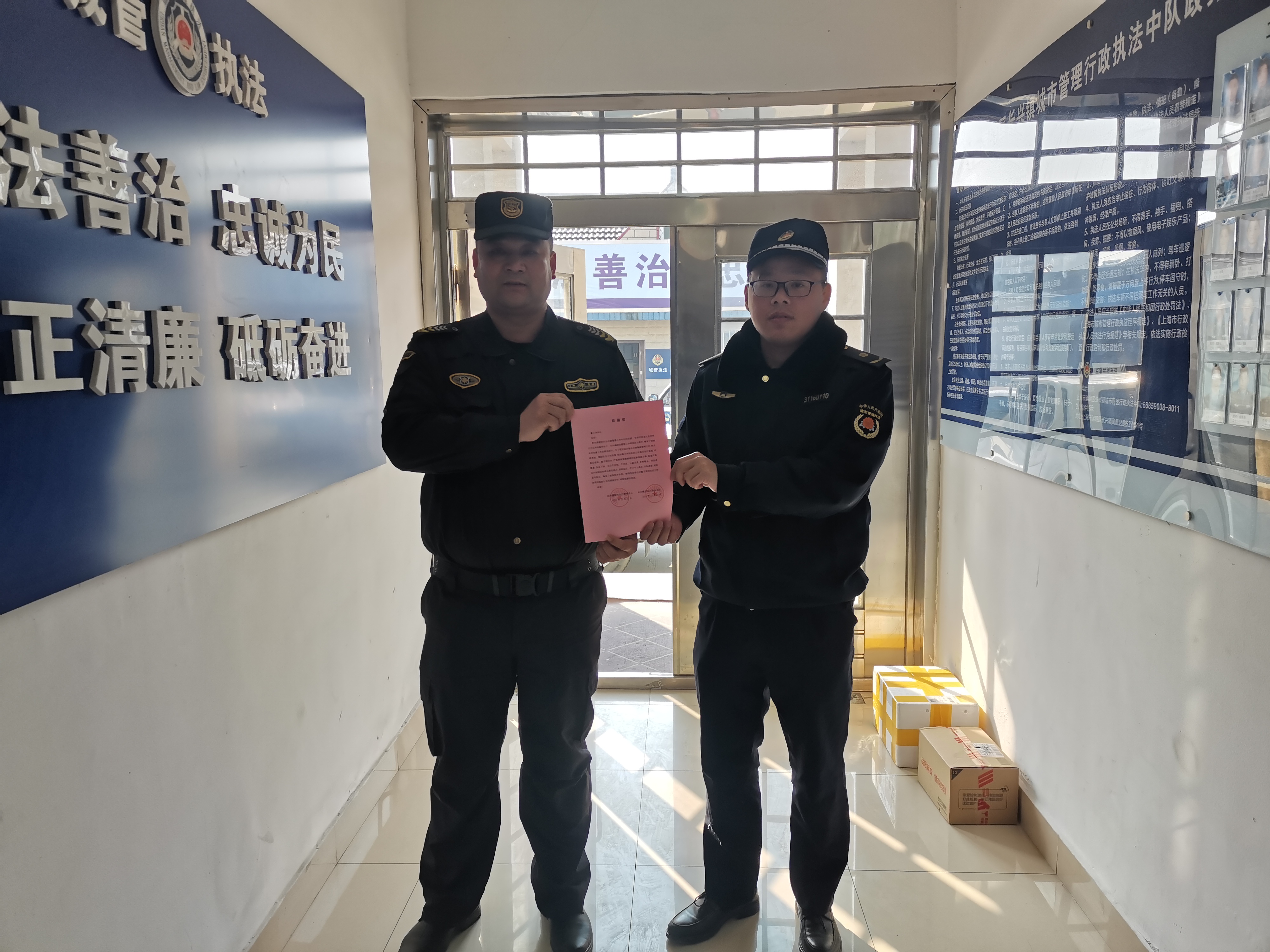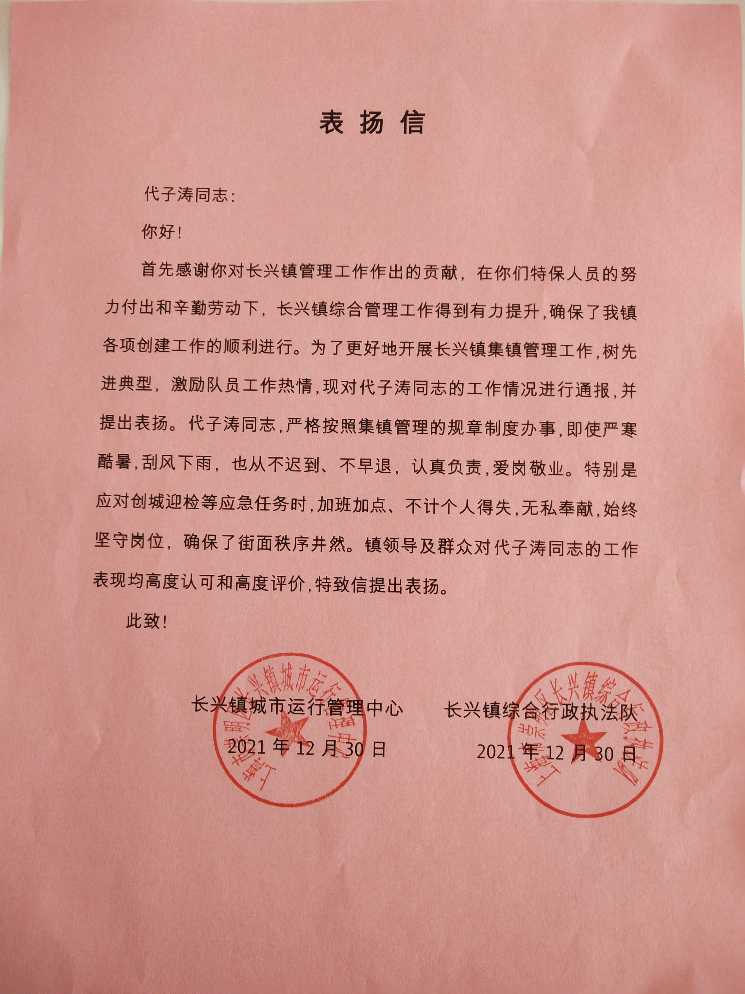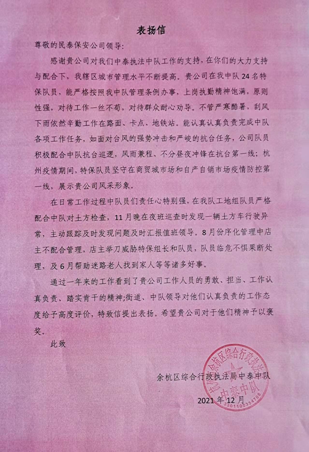 12月29日,浙江民泰駐中泰城管輔助項目收到余杭區中泰街道城管中隊副中隊長(cháng)王哲送來(lái)的表?yè)P信,信中對民泰隊員履職盡責的工作表現予以表?yè)P。