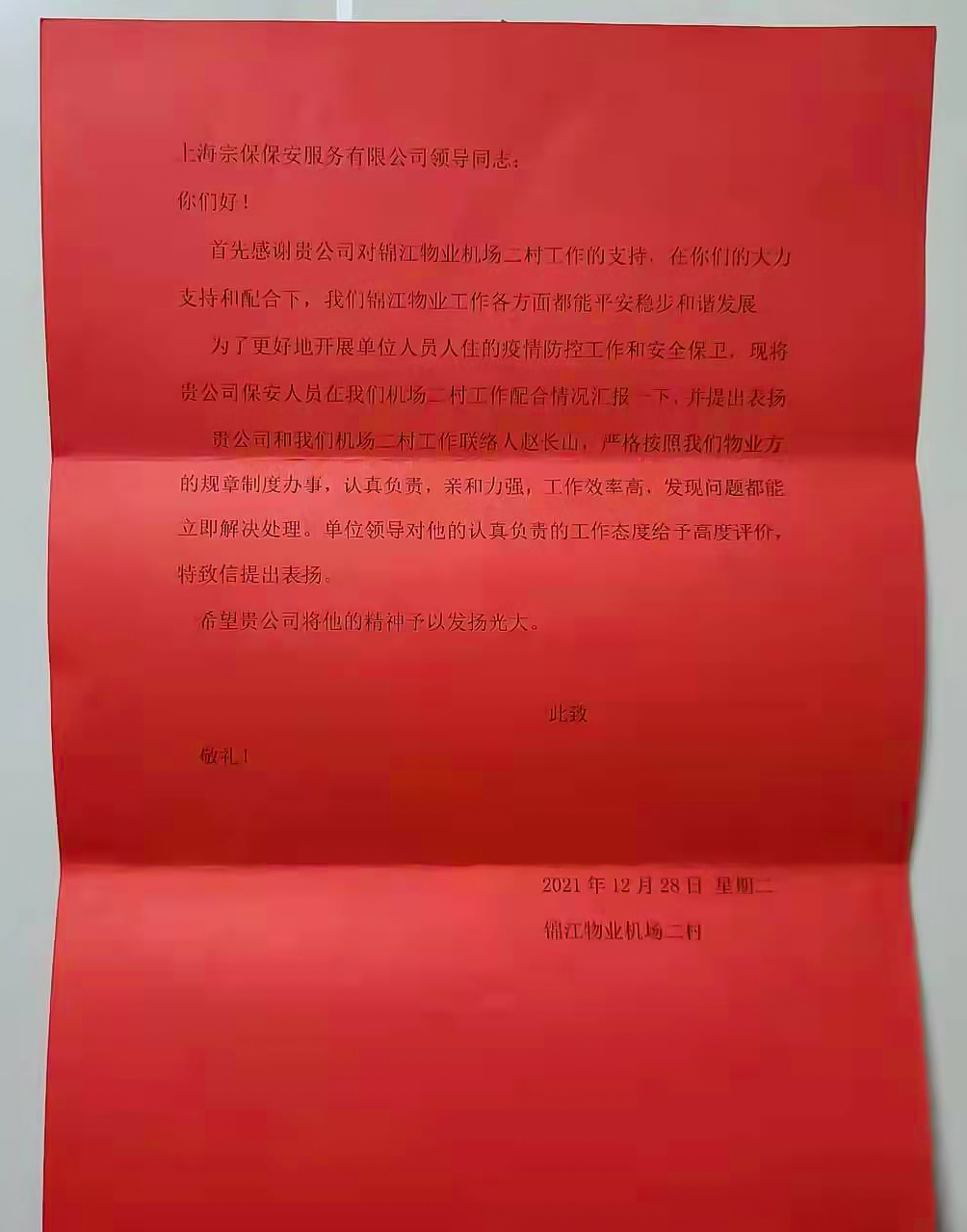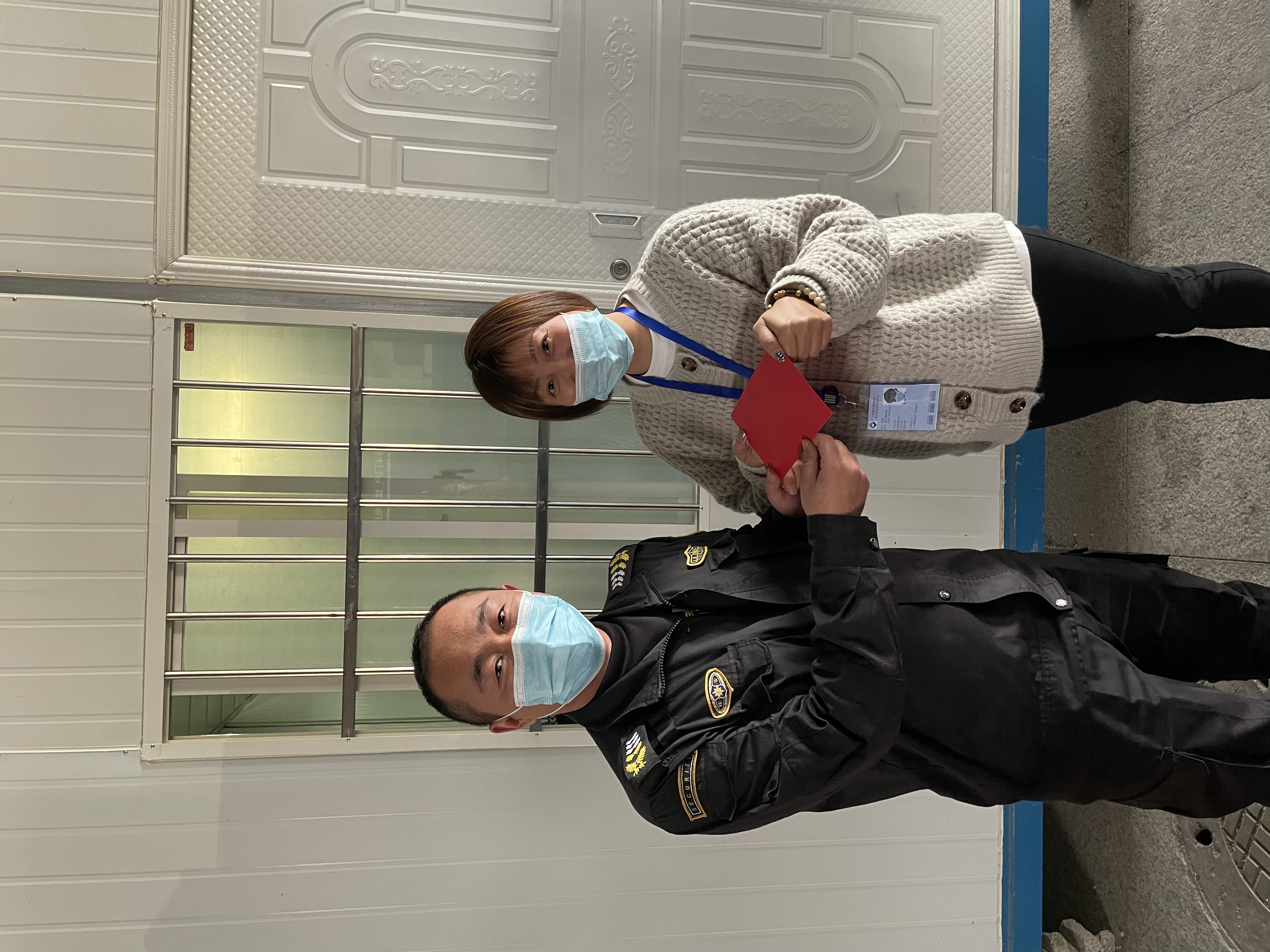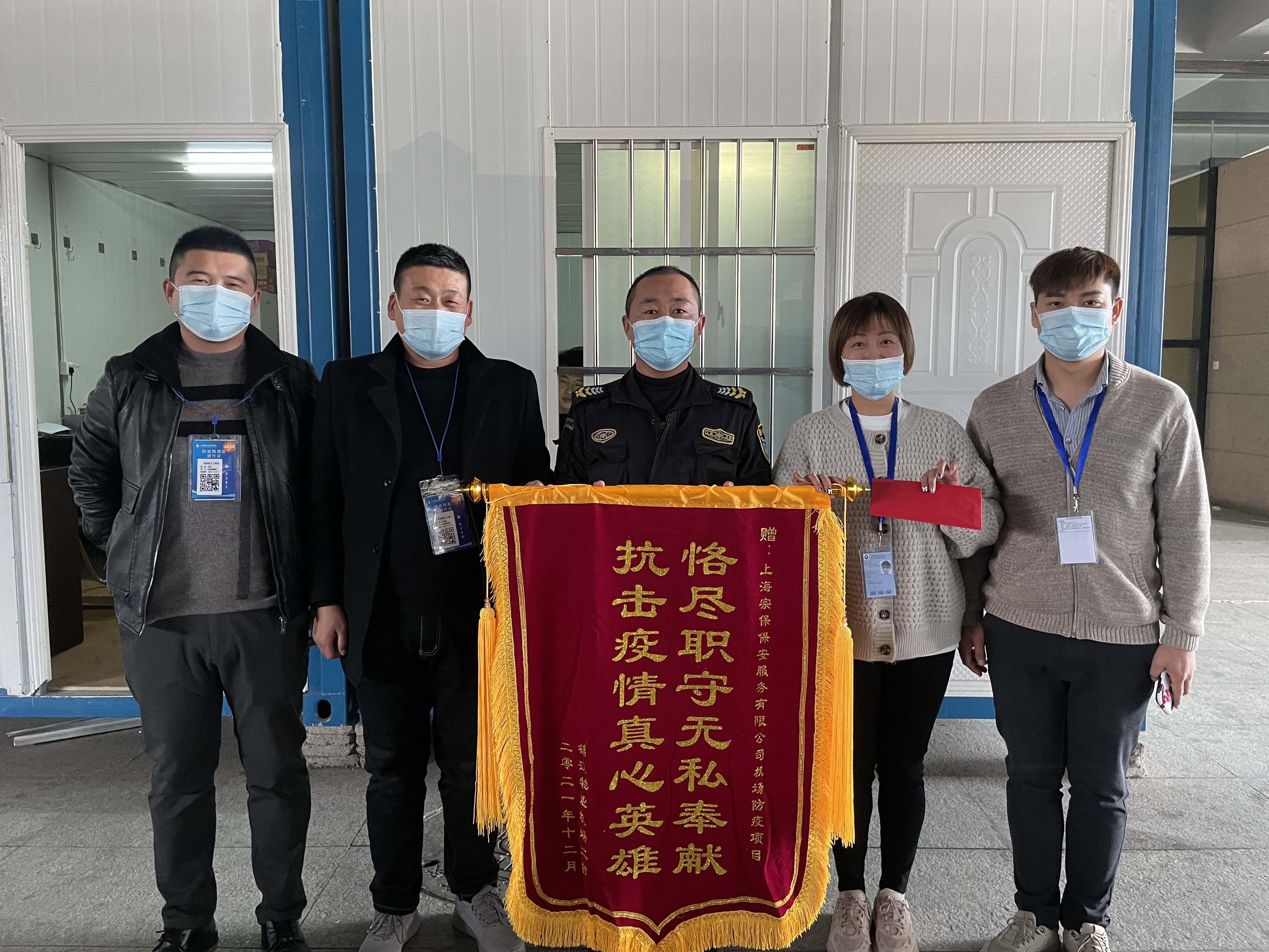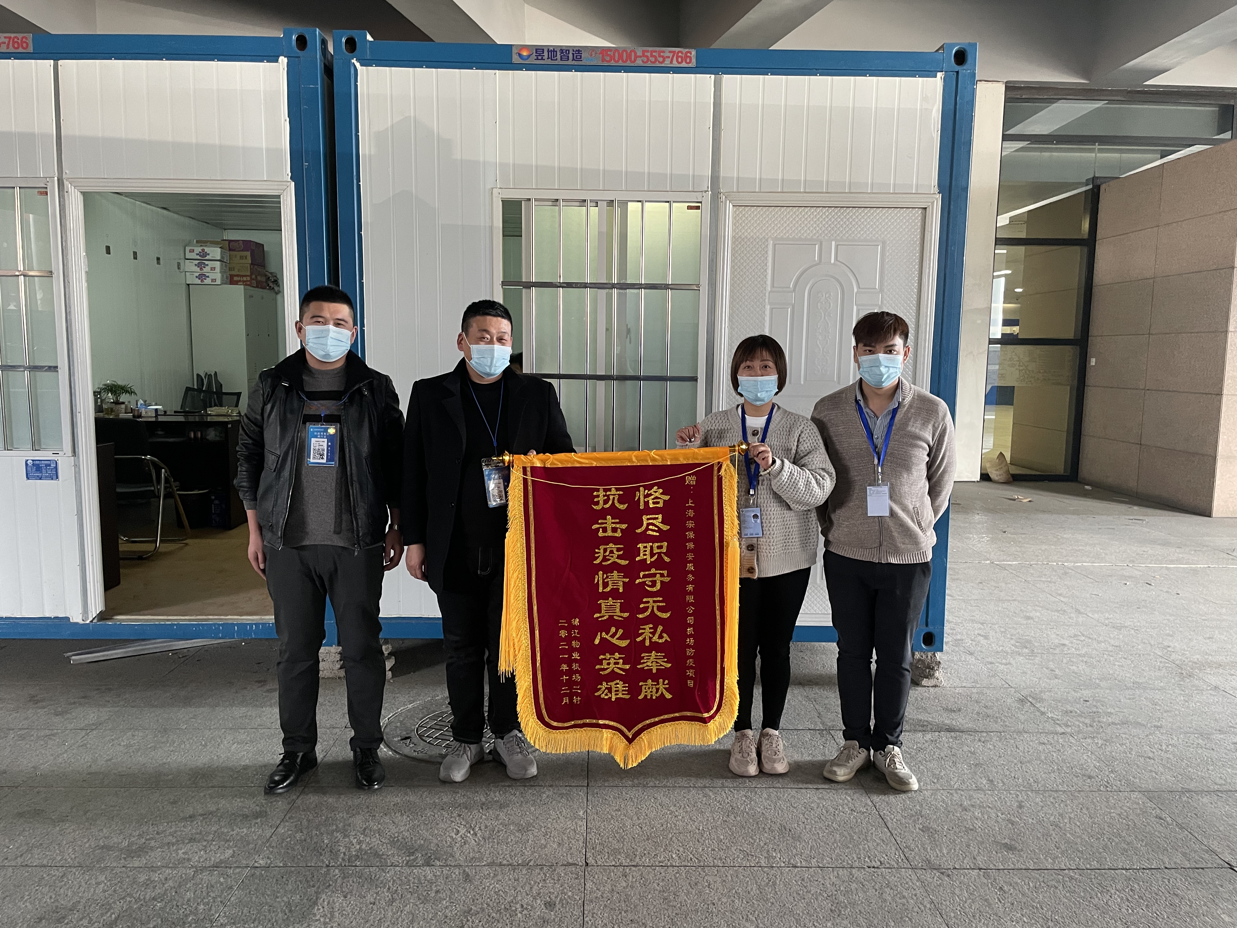 12月31日,錦江物業(yè)機場(chǎng)二村經(jīng)理莊敏和辦公室總監孟銀行,將繡有“恪盡職守無(wú)私奉獻 抗擊疫情真心英雄”的錦旗和表?yè)P信送到宗保公司機場(chǎng)防疫項目,感謝宗保公司對其工作的大力支持,表?yè)P隊員趙長(cháng)山突出的工作表現。