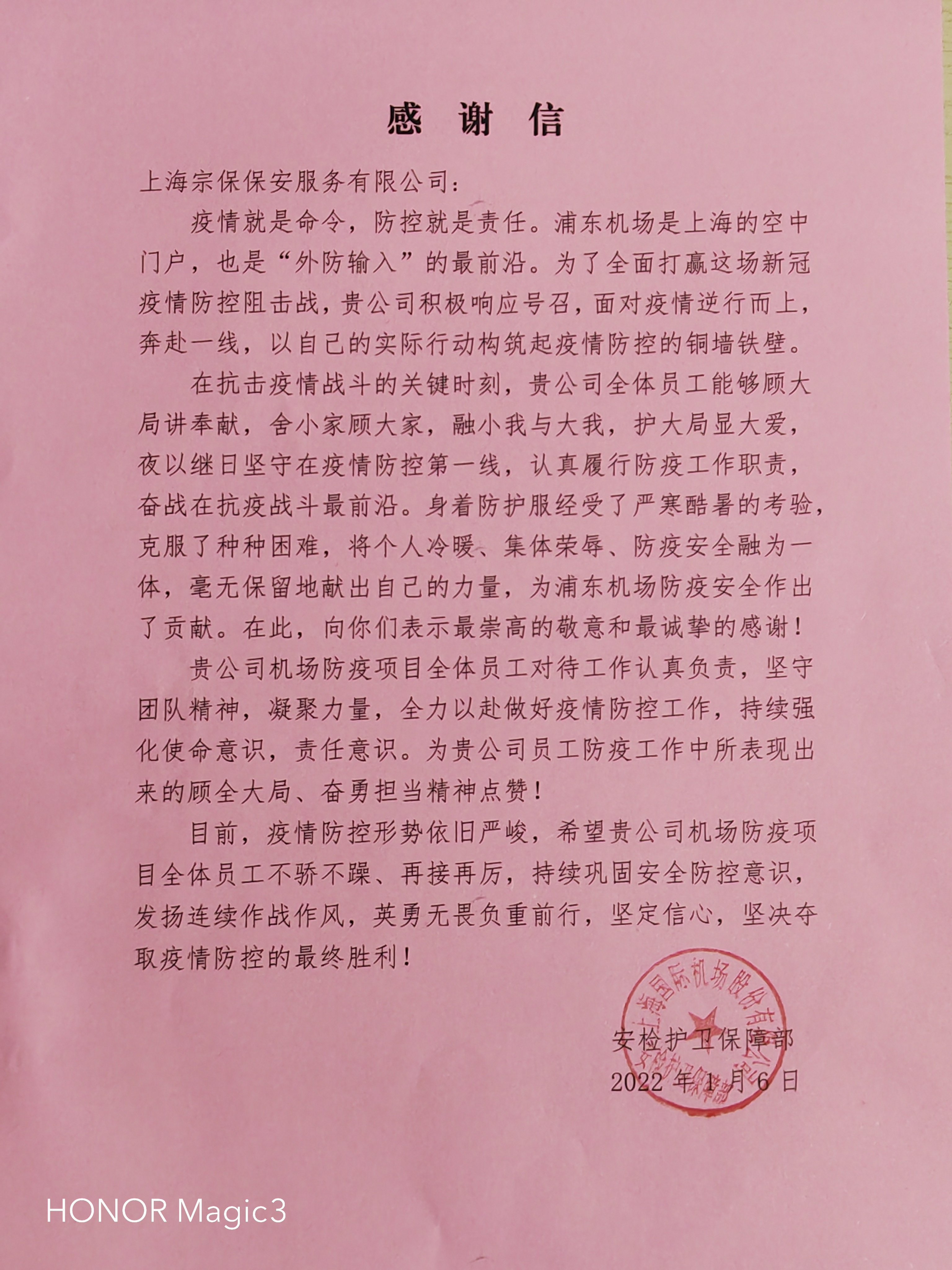 機場(chǎng)股份公司安檢護衛保障部贈送錦旗是對宗保公司駐機場(chǎng)防疫項目全體員工所做工作的肯定,不僅僅是榮譽(yù)和鼓勵,更是鞭策和責任。公司將繼續發(fā)揚主動(dòng)作為、奉獻擔當的作風(fēng),踐行不懼風(fēng)險、勇毅前行的精神,增強攜手共進(jìn)、履責于行的協(xié)同意識,與甲方一道共同筑好浦東機場(chǎng)疫情防控銅墻鐵壁,為全力保障市民健康安全作出新貢獻。