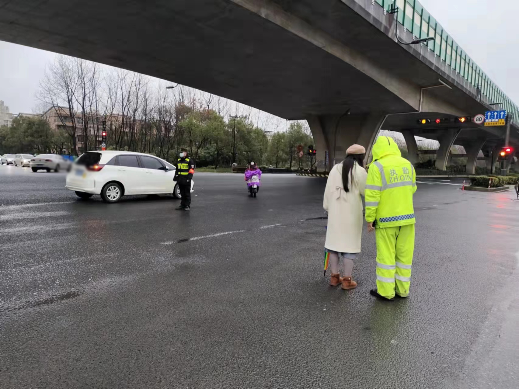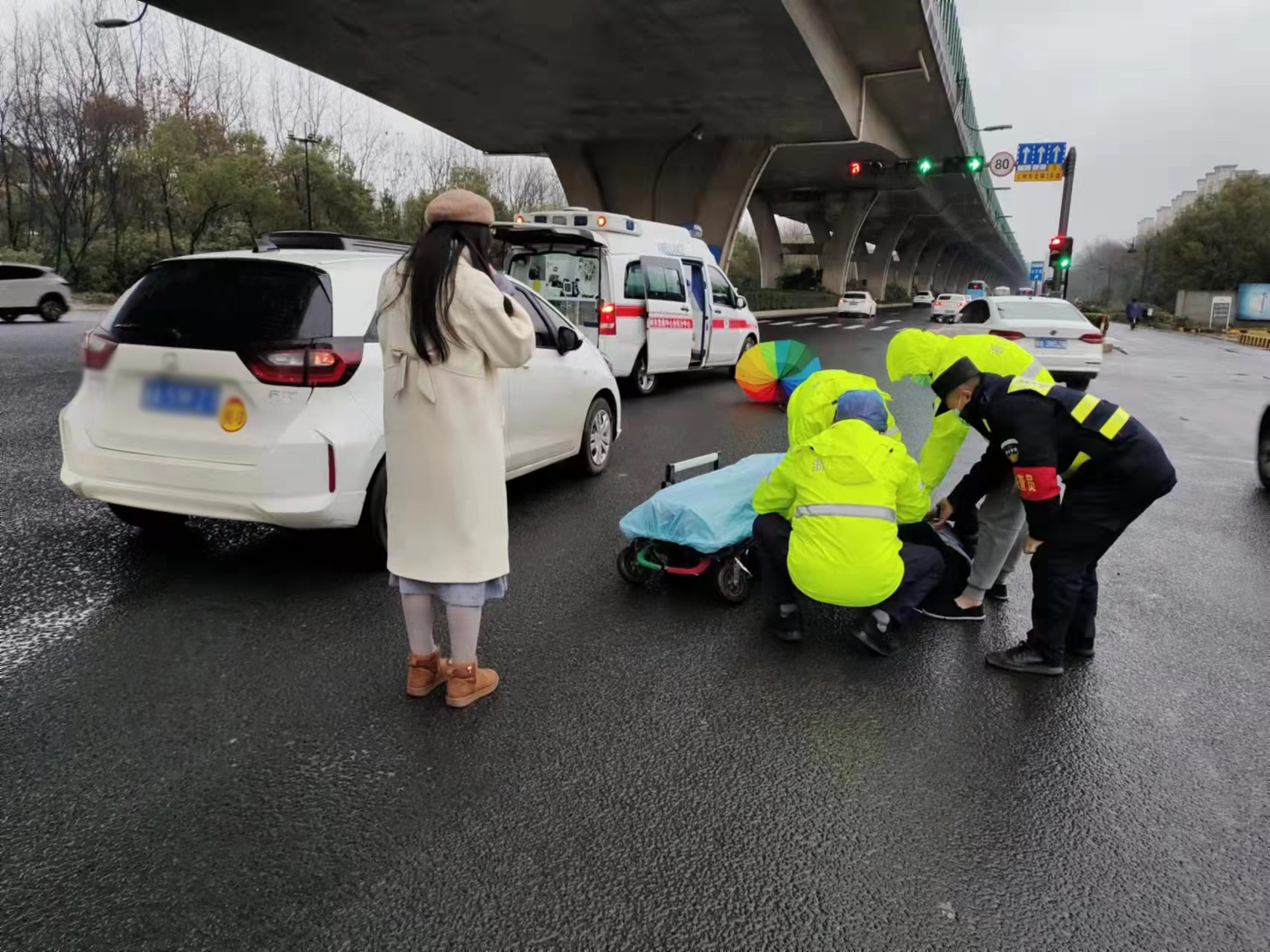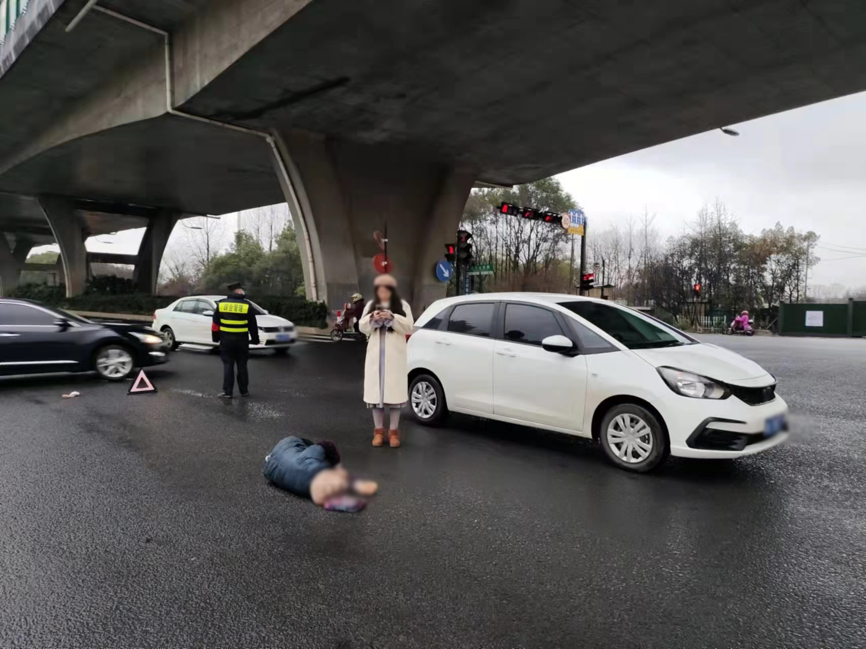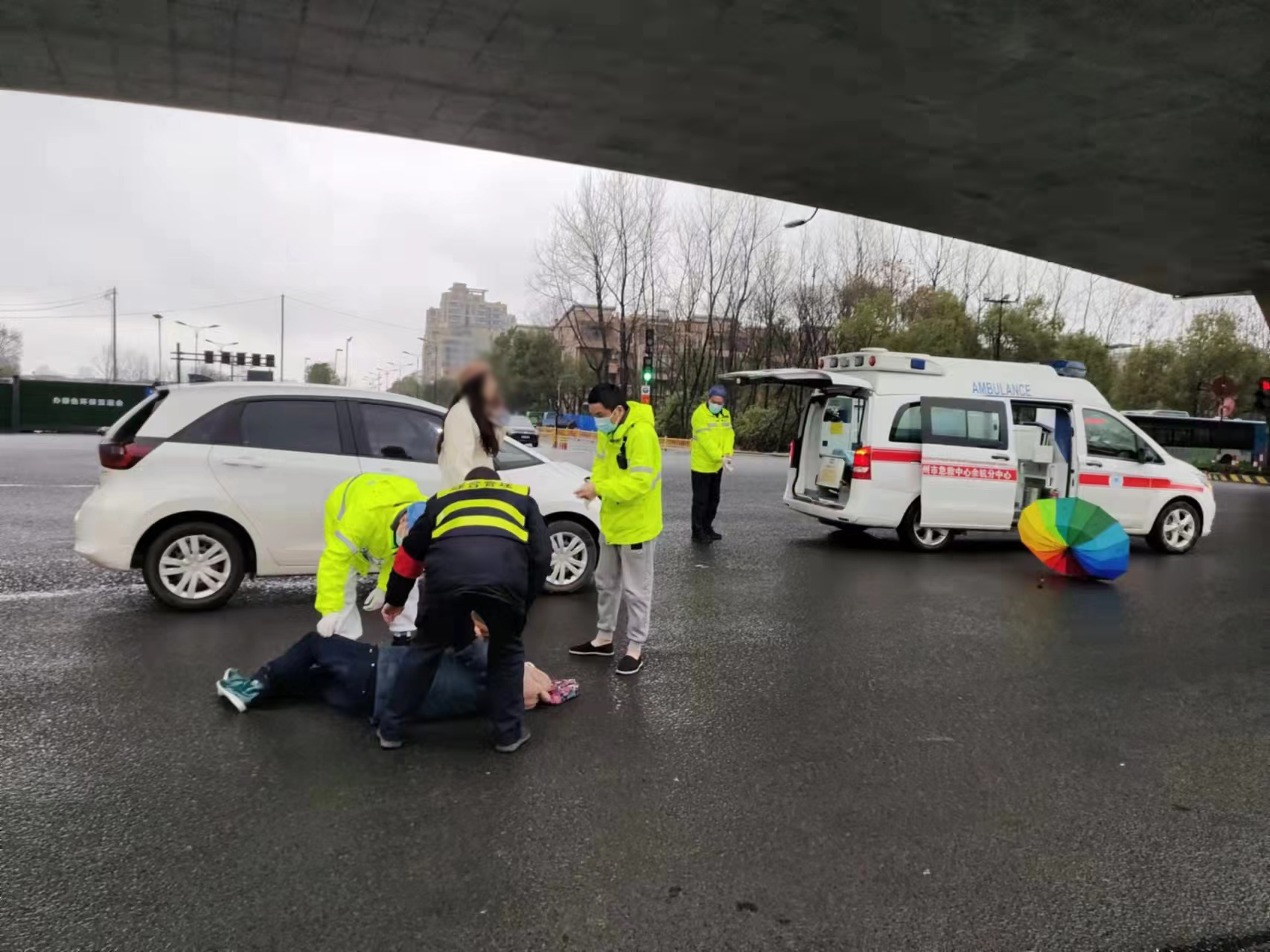 當日9:20,宋亭、呂劍強在天目山路良睦路口巡邏時(shí),發(fā)現前方路口發(fā)生交通事故,便立即上前查看,一輛行駛的轎車(chē)將行人撞到在地,受傷女子躺在馬路中間。