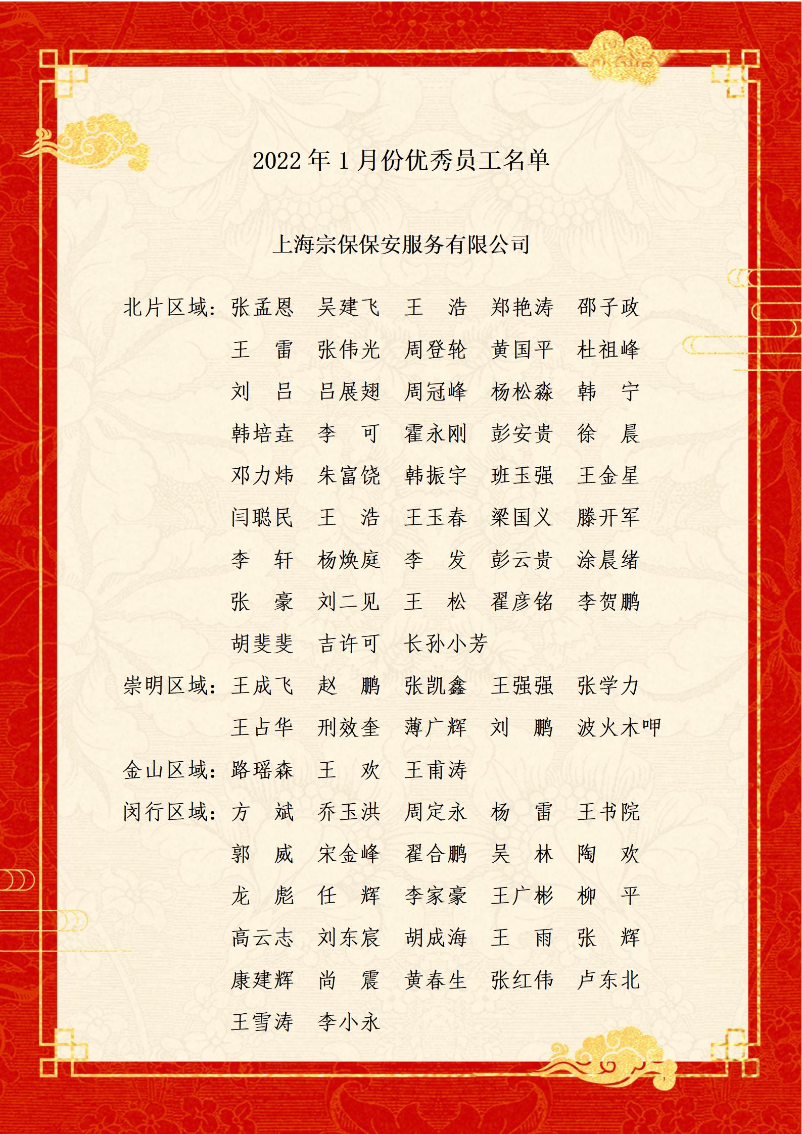 1月份,公司廣大員工根據甲方的工作部署,按照公司的工作要求,秉承不懼風(fēng)險、勇毅前行、連續奮戰的工作作風(fēng),堅守疫情防控一線(xiàn),協(xié)助完成臨港新片區元旦煙花秀技防保障、景區大客流保障、清除外來(lái)物種、掃雪除冰等任務(wù),多個(gè)項目和隊員獲得表彰。期間,涌現出了一批盡心履責、崗位建功、拾金不昧、助人為樂(lè )的優(yōu)秀員工和先進(jìn)典型。