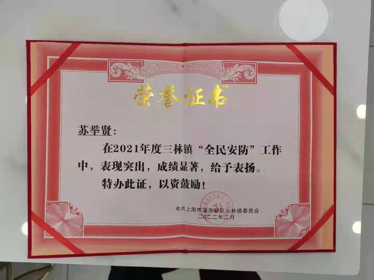 3月2日下午,三林鎮召開(kāi)2022年政法信訪(fǎng)工作會(huì )議,公司駐依水園派出所項目隊員蘇舉賢在2021年度三林鎮“全民安防”工作中,表現突出,榮獲表彰。