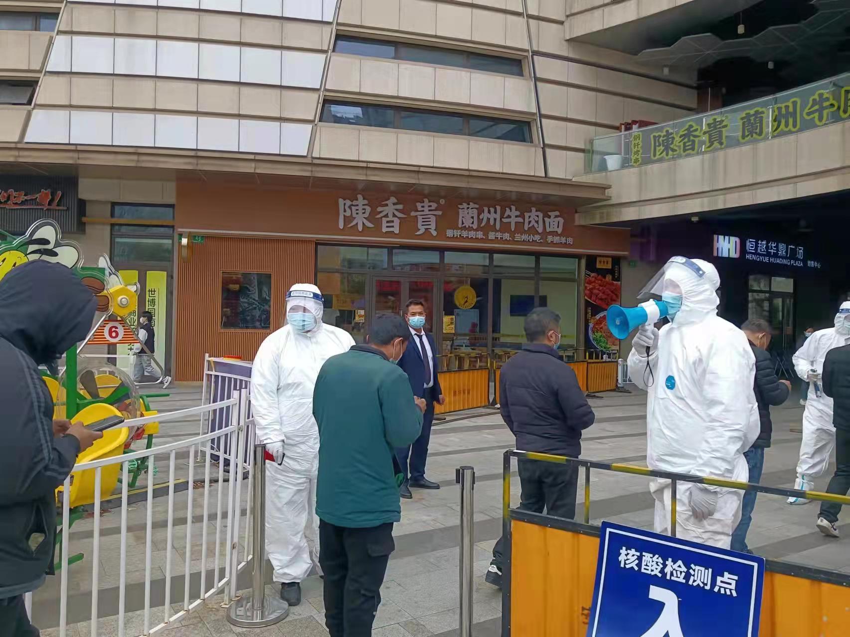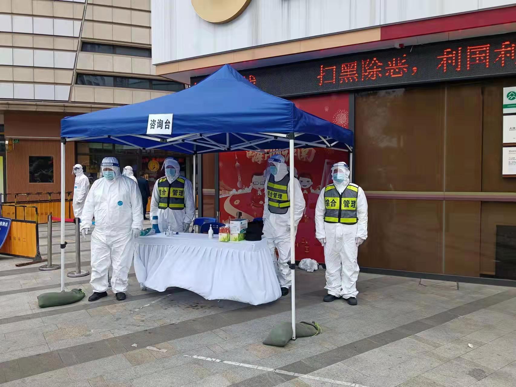 公司駐三林項目員工在恒越廣場(chǎng)協(xié)助維護核酸檢測秩序,引導居民掃碼、登記身份信息,提醒居民保持2米安全距離。
