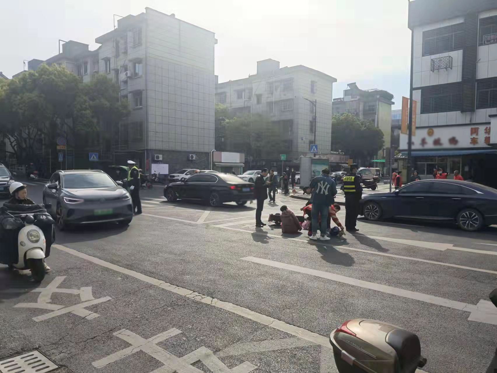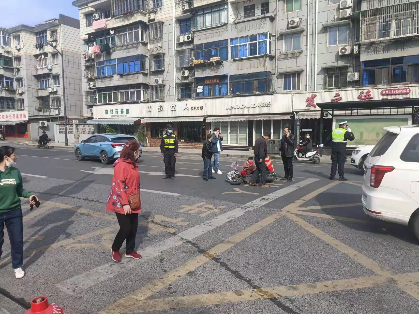 當天9:20,陳國清在文苑路文體中心附近巡邏時(shí),看見(jiàn)前方不遠處的路口發(fā)生了交通事故,便立即前往查看。原來(lái)是一輛轎車(chē)將騎電動(dòng)車(chē)的阿姨撞倒在地,電動(dòng)車(chē)倒在一旁,阿姨坐在地上。