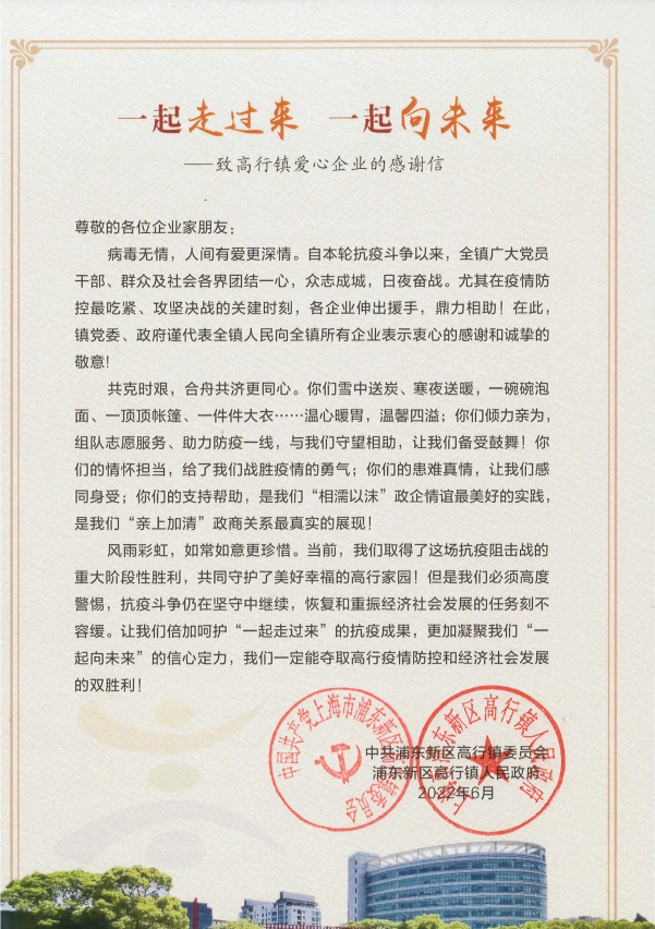 6月9日,宗保公司收到浦東新區高行鎮人民政府的感謝信,感謝公司對高行鎮疫情防控工作的大力支持。