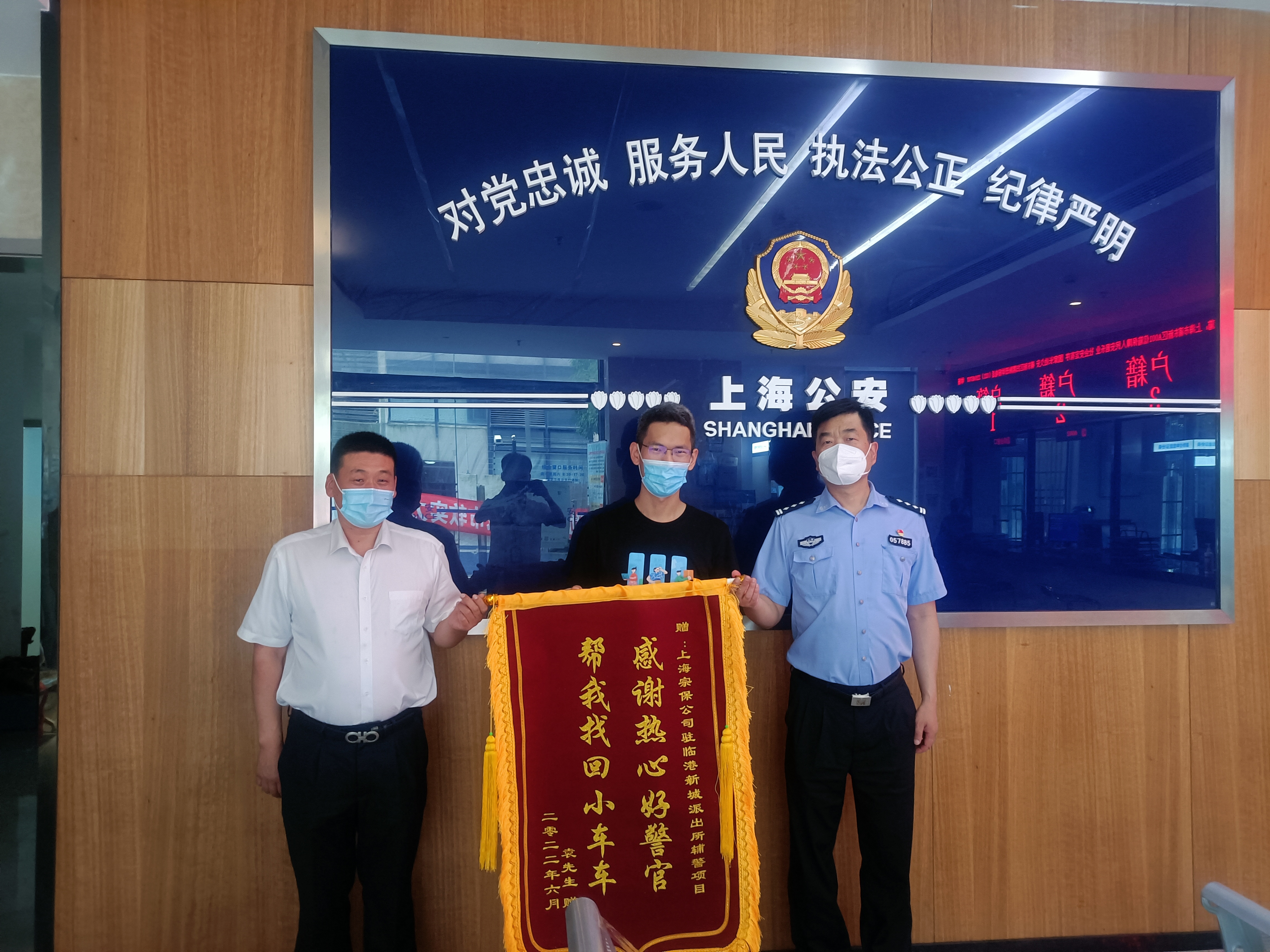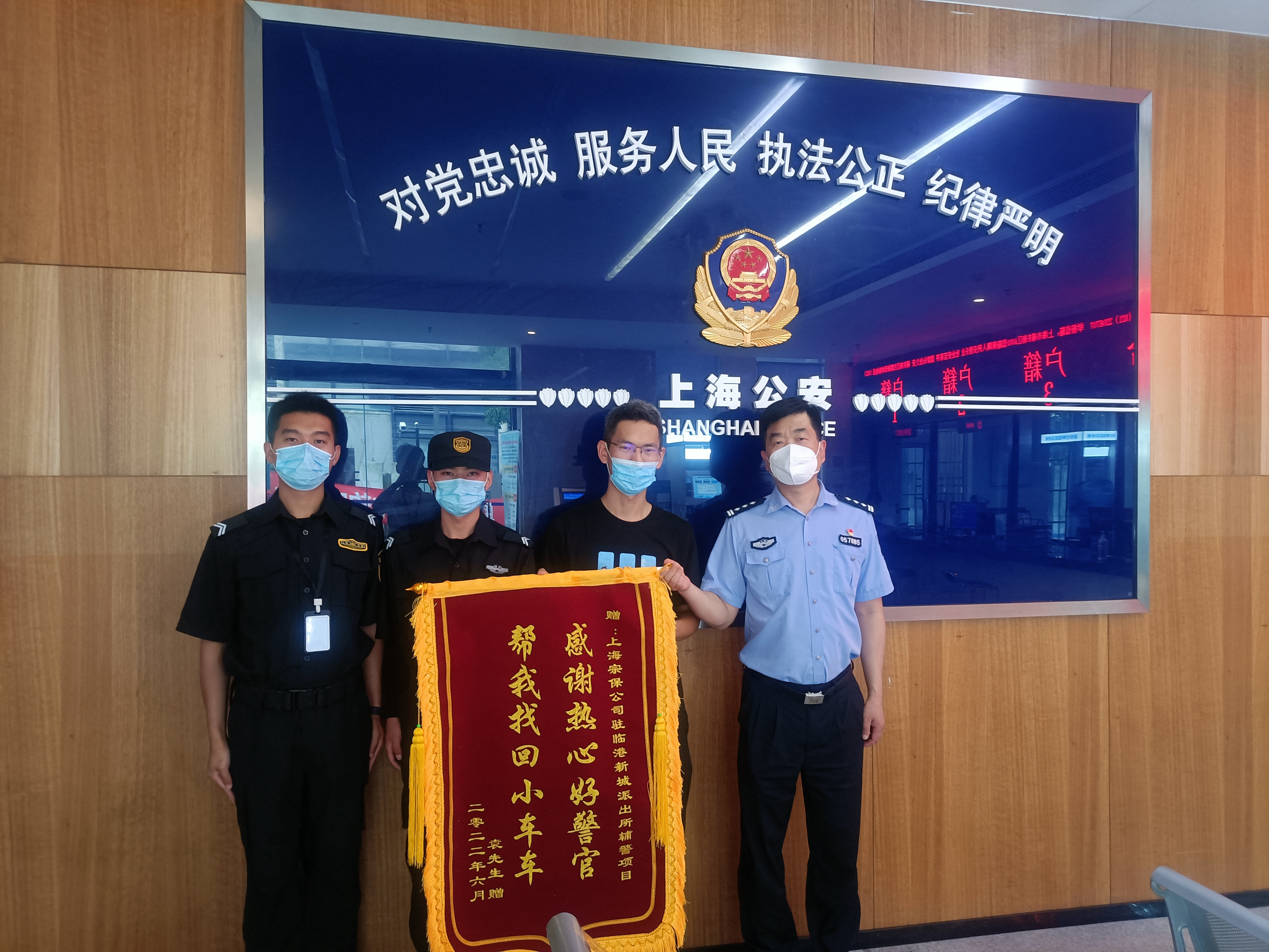 6月24日,市民袁先生將一面繡有“感謝熱心好警官 幫我找回小車(chē)車(chē)”的錦旗贈送給宗保公司駐臨港新城派出所輔警項目隊員楊明來(lái),感謝他幫忙找回被盜電動(dòng)車(chē)。
