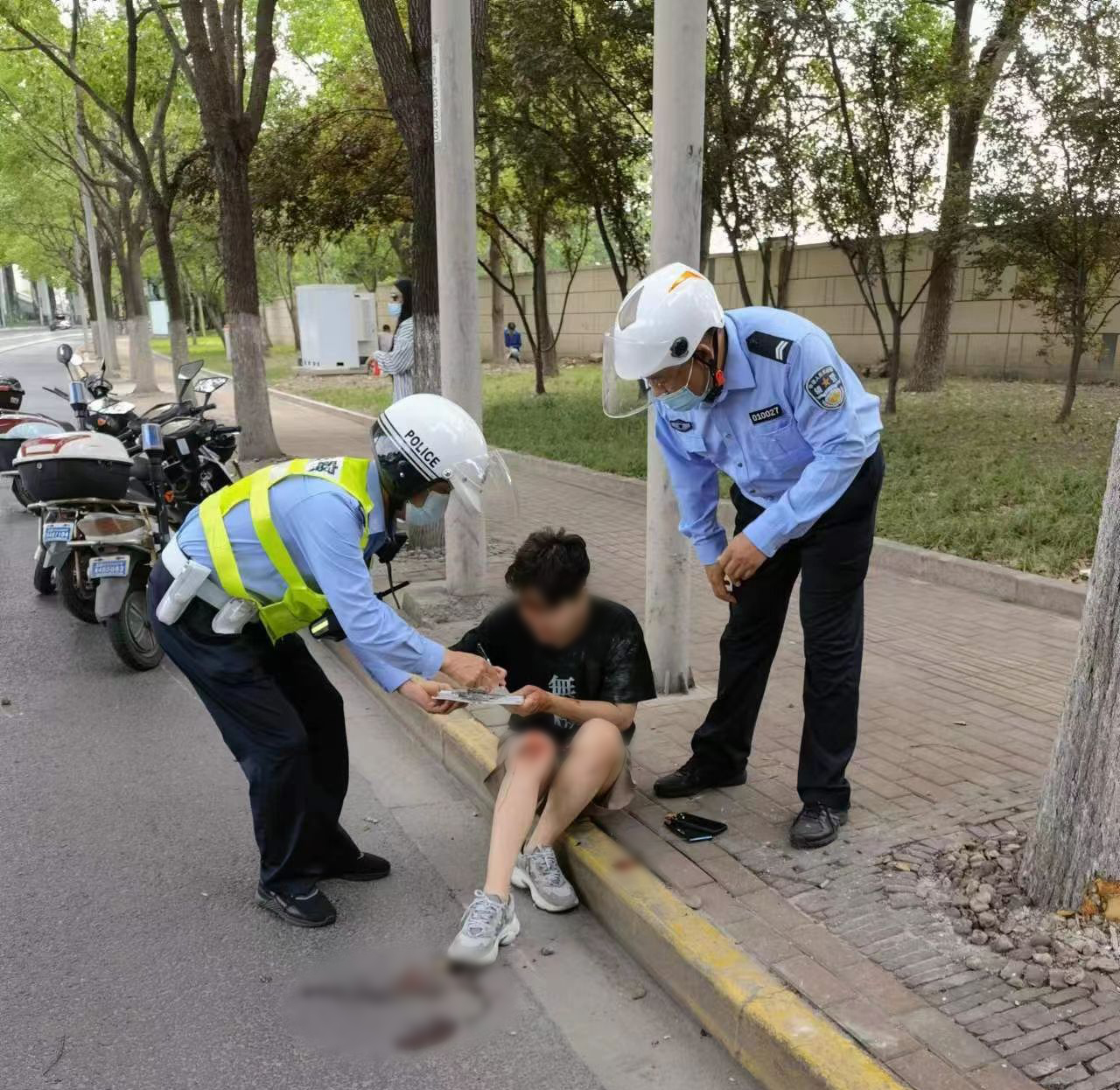 原來(lái)是一名騎電動(dòng)車(chē)的男子超車(chē)時(shí),撞倒了同向騎共享單車(chē)的白衣女子。白衣女子腰部受傷,一時(shí)無(wú)法動(dòng)彈;而男子的臉部、膝蓋一直流著(zhù)血,看起來(lái)也比較嚴重。