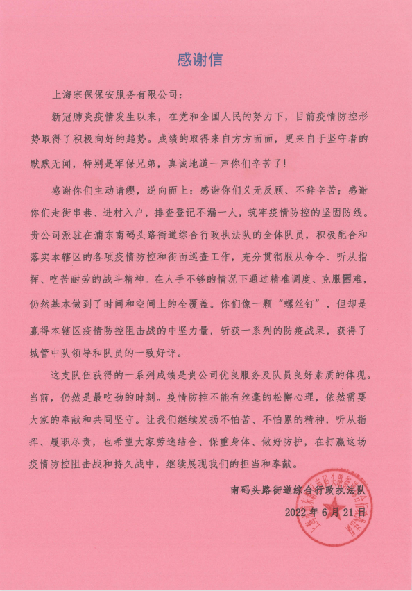 6月21日,宗保公司收到南碼頭路街道綜合行政執法中隊的感謝信,信中對公司員工在疫情防控期間所做的工作和辛勤的付出表示衷心的感謝。
