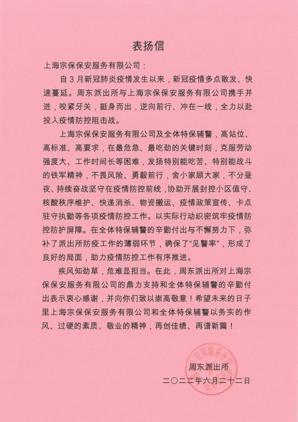 6月28日,宗保公司收到浦東公安分局周東派出所的表?yè)P信,表?yè)P疫情防控期間宗保公司全力支持和配合派出所開(kāi)展疫情防控所做的工作。