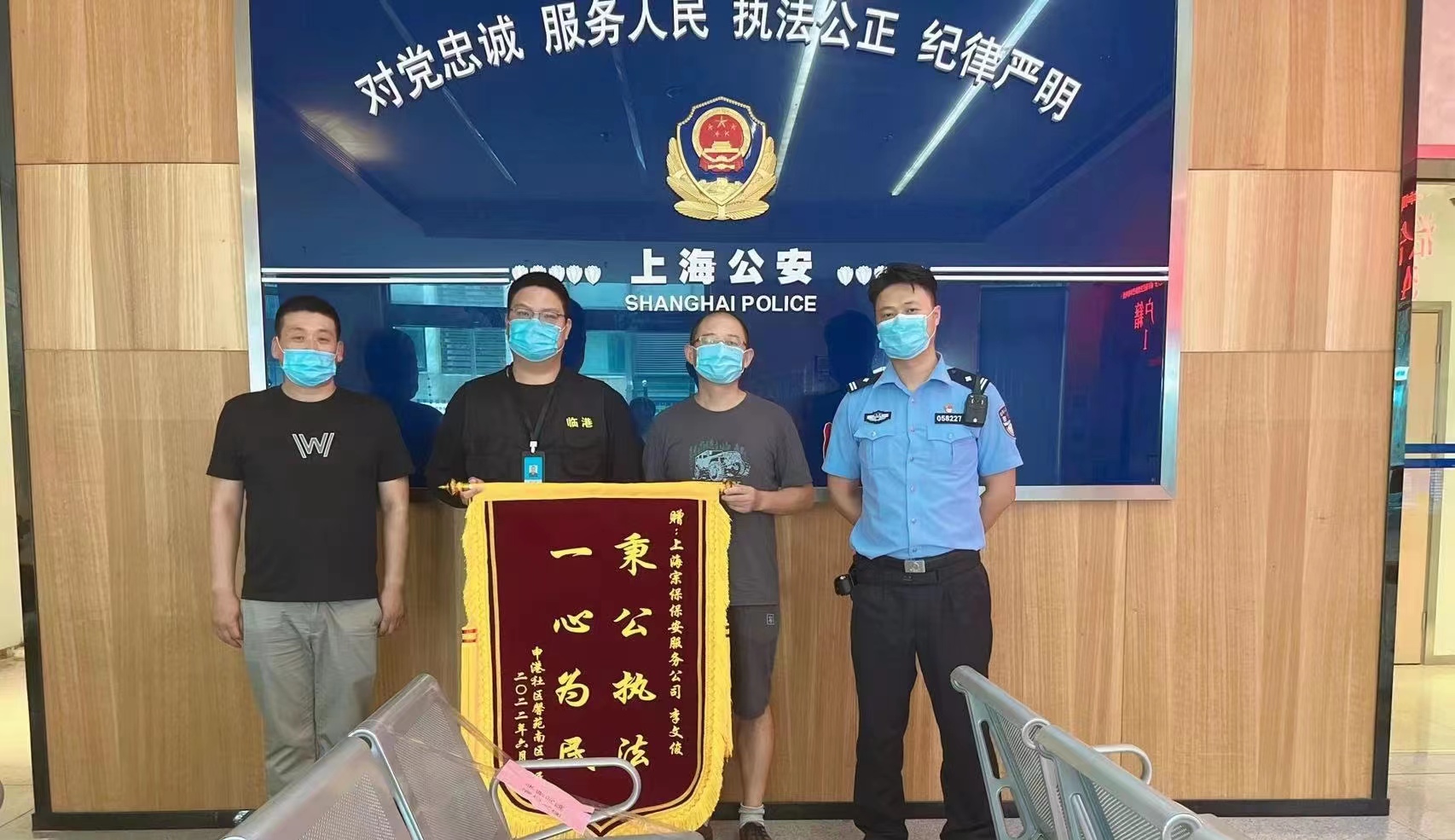 7月8日,宗保公司駐臨港新城輔警項目隊員李文俊收到中港社區馨苑南區居民贈送的一面繡有“秉公執法 一心為民”的錦旗,贊揚他克制忍讓的行為。