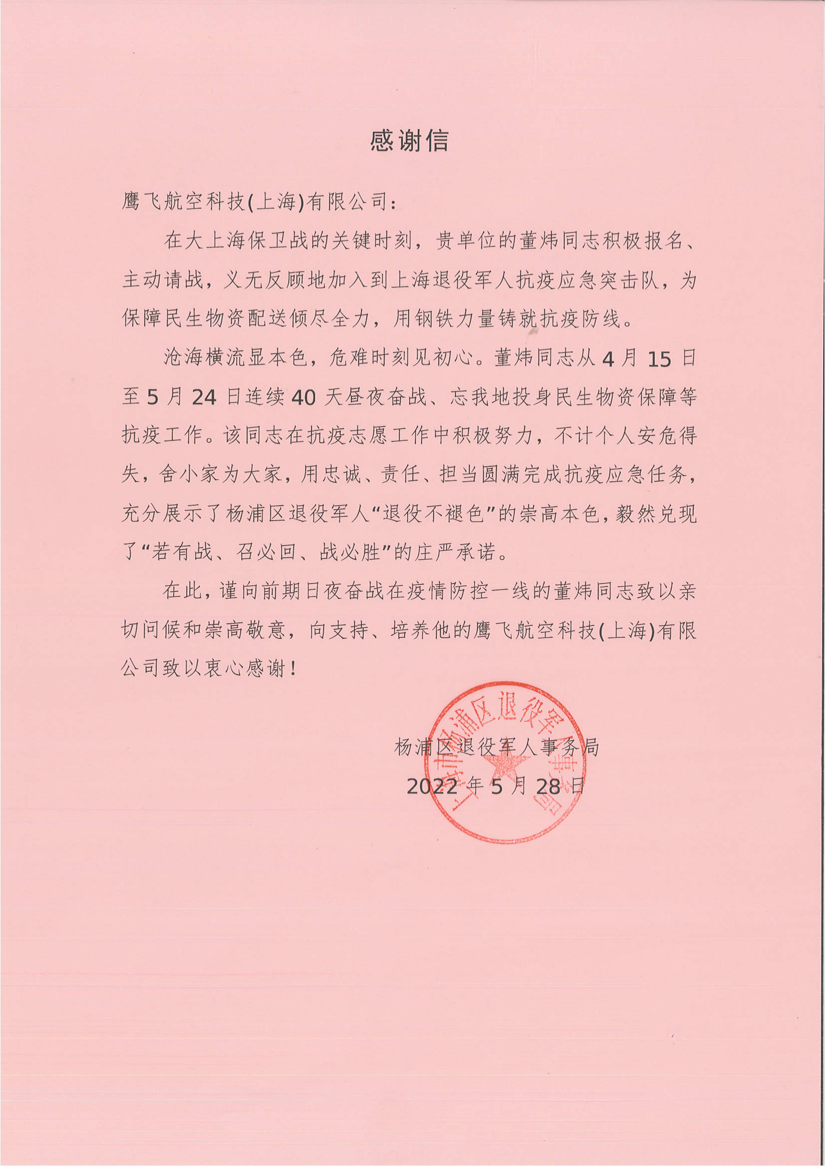 5月28日,鷹飛航空科技(上海)有限公司收到楊浦區退役軍人事務(wù)局的感謝信,感謝公司員工董煒對其疫情防控工作的全力支持和傾心配合。