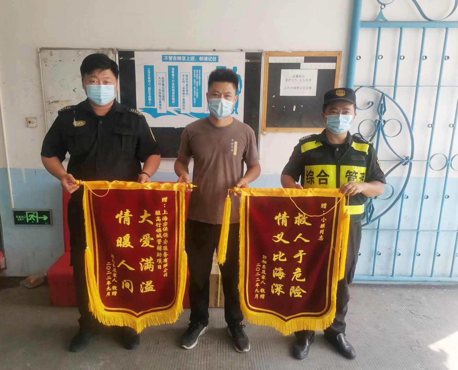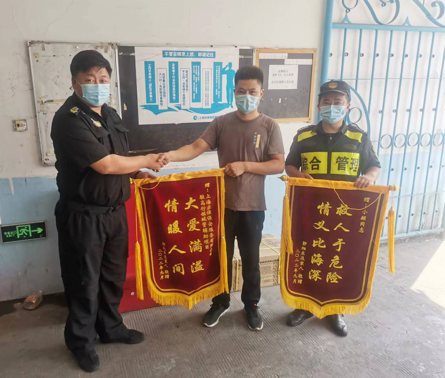 9月8日,宗保公司駐高行市容項目收到市民郭先生送來(lái)的兩面繡有“救人于危險 情義比海深”和“大愛(ài)滿(mǎn)溢 情暖人間”的錦旗,感謝宗保員工顧俊機智救下欲跳樓輕生小男孩的行為。