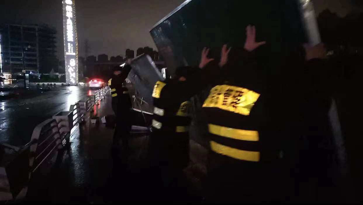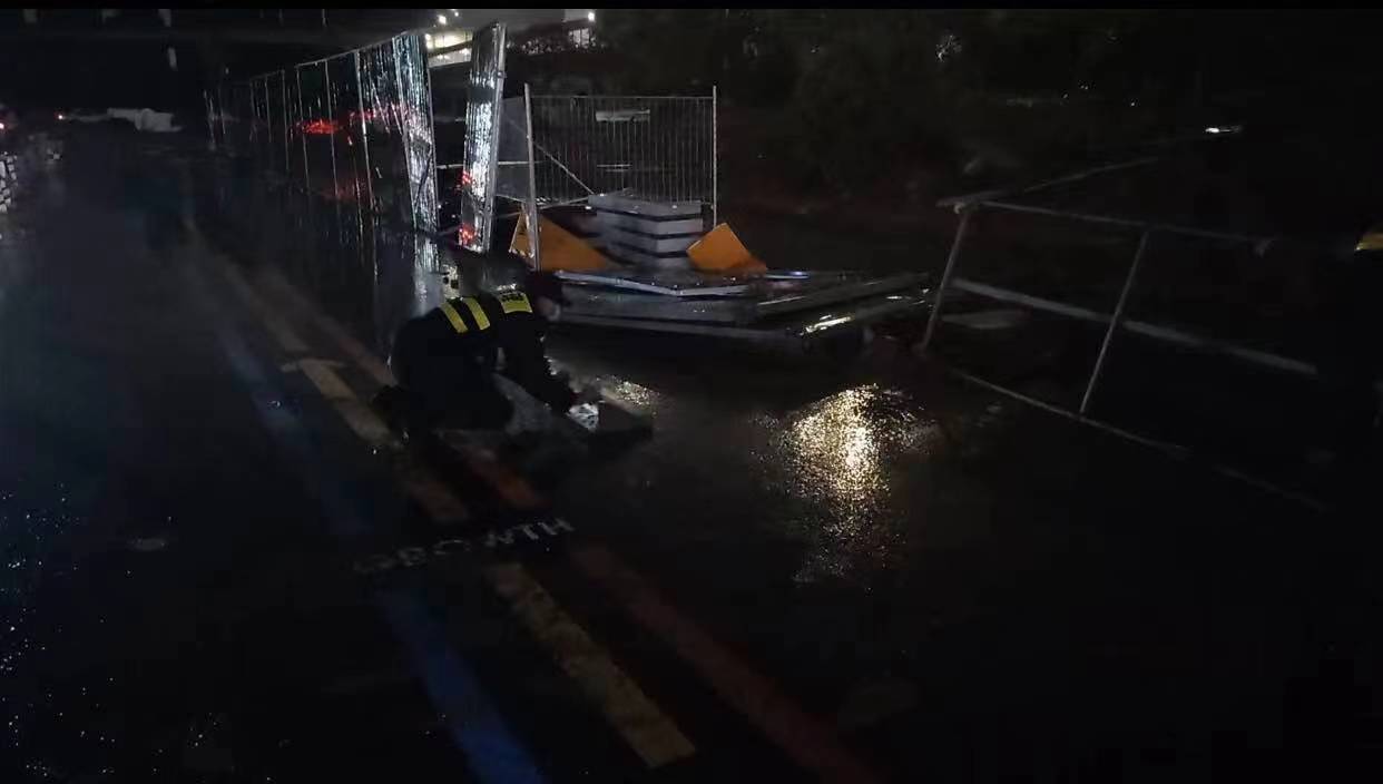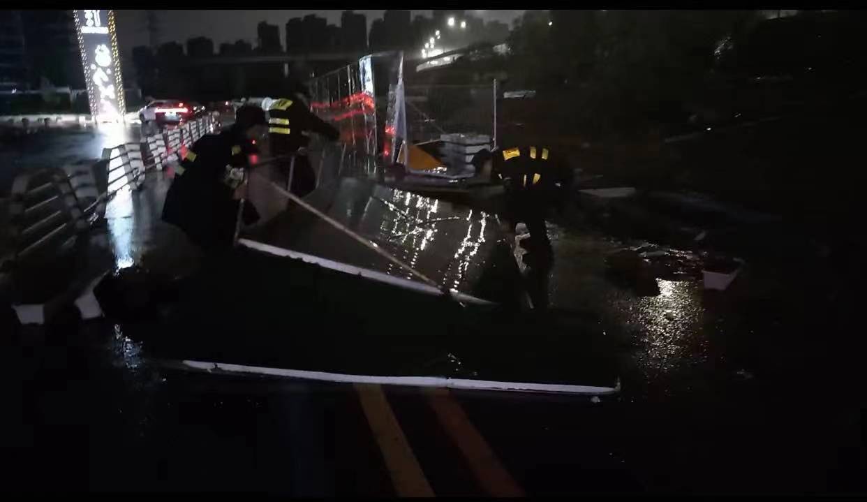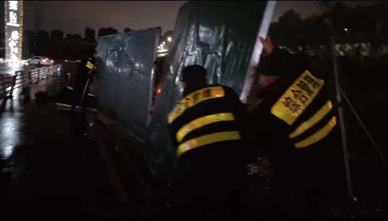 當日20:12,公司員工黃華和郭子威在嚴村里路古墩路口巡邏時(shí),看到馬路邊施工的綠色圍擋被風(fēng)吹倒,占據半幅車(chē)道,嚴重影響車(chē)輛通行,而當時(shí)正下著(zhù)大雨,再加上天色已暗,存在著(zhù)極大的安全隱患。